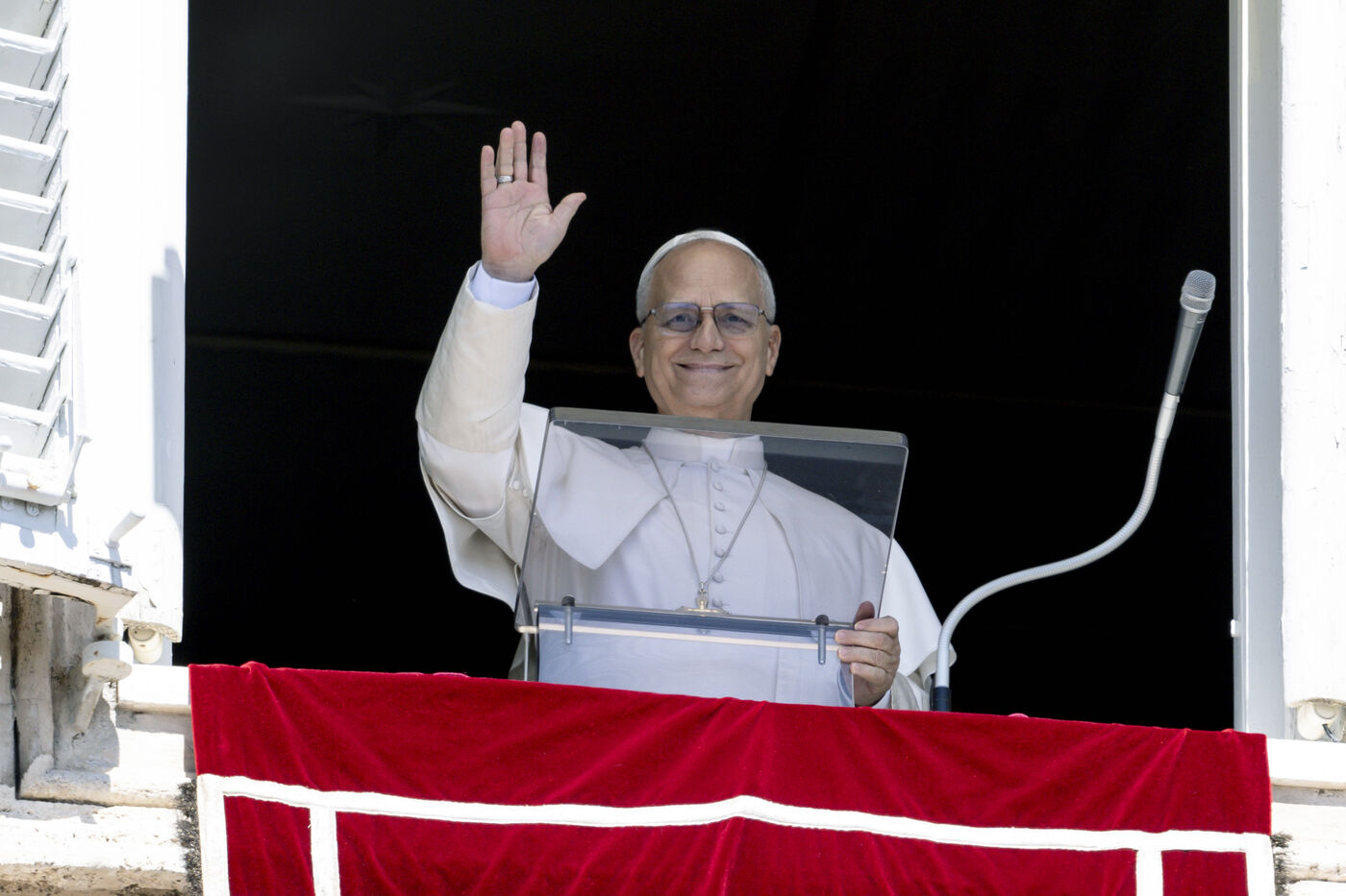 Le pape Léon XIV s'adresse à la foule depuis la fenêtre du palais apostolique donnant sur la place Saint-Pierre pendant la prière du Regina Caeli au Vatican le 2025/8/31.