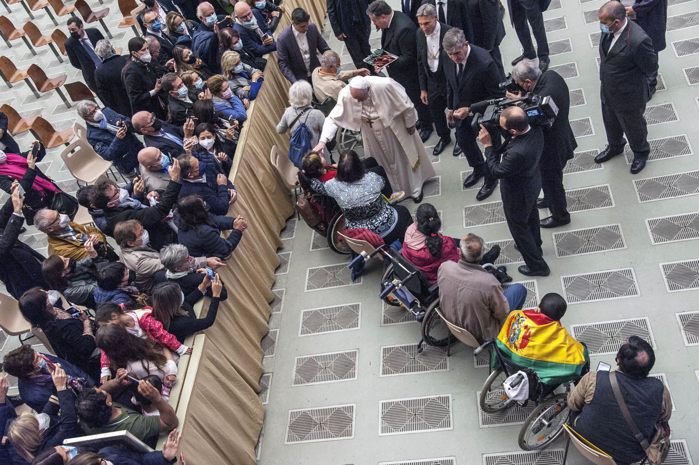 Italy, Rome, Vatican, 2021/10/20. Pope Francis gives his blessing during his weekly general audience in the Pope Paul VI hall at the Vatican. Photograph by Massimiliano Migliorato / Catholic Press Photo / HANS LUCAS.