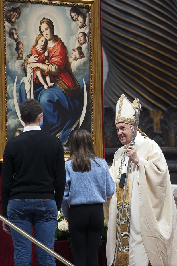 Italie, Rome, Vatican, 2021/11/21. Le Pape François célèbre la Sainte Messe de la Solennité de Notre Seigneur Jésus-Christ Roi de l'Univers XXXVIème Journée Mondiale de la Jeunesse dans la Basilique Vaticane.
