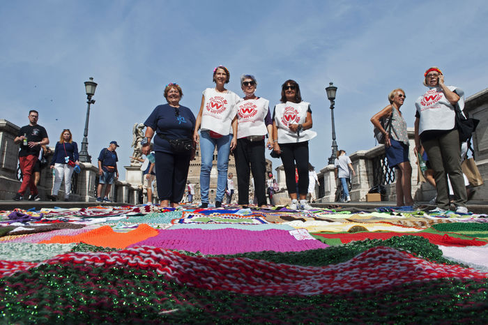 Italy, Rome, Vatican, 2021/09/25. Castel Sant'Angelo to say together NO to violence against women. The event VIVA VITTORIA - ROME, an installation of 2,100 square meters of blankets made by over 6,000 women and a few men. The blankets will be the subject of donations that will go to two projects that help women in need: the first is DIFFERENCE WOMEN and helps disabled women victims of violence, the second is a structure that helps homeless women to recover their dignity.