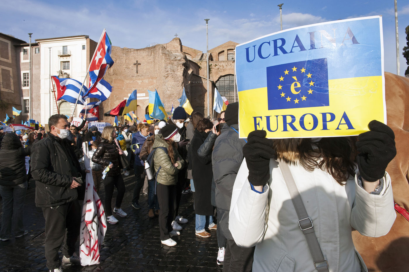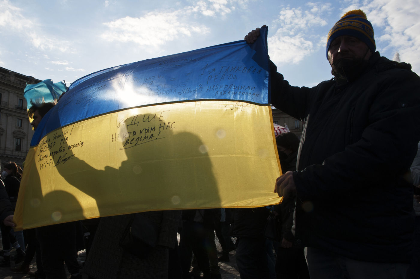 Italy, Rome, 2022/02/27. People hold Ukrainian flags as they demonstrate against the war in Ukraine, in Rome.