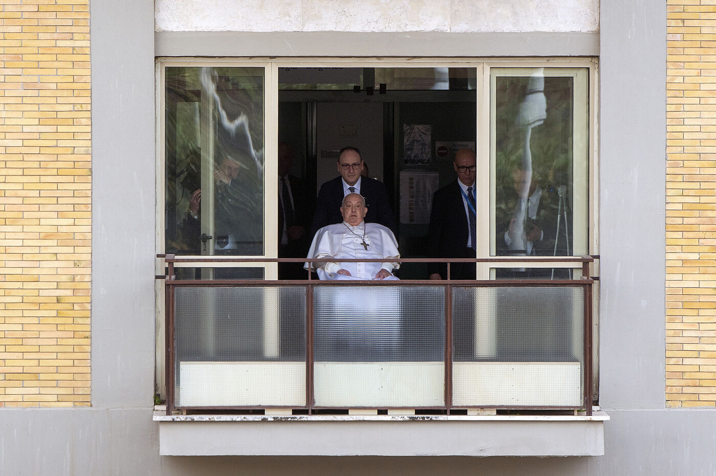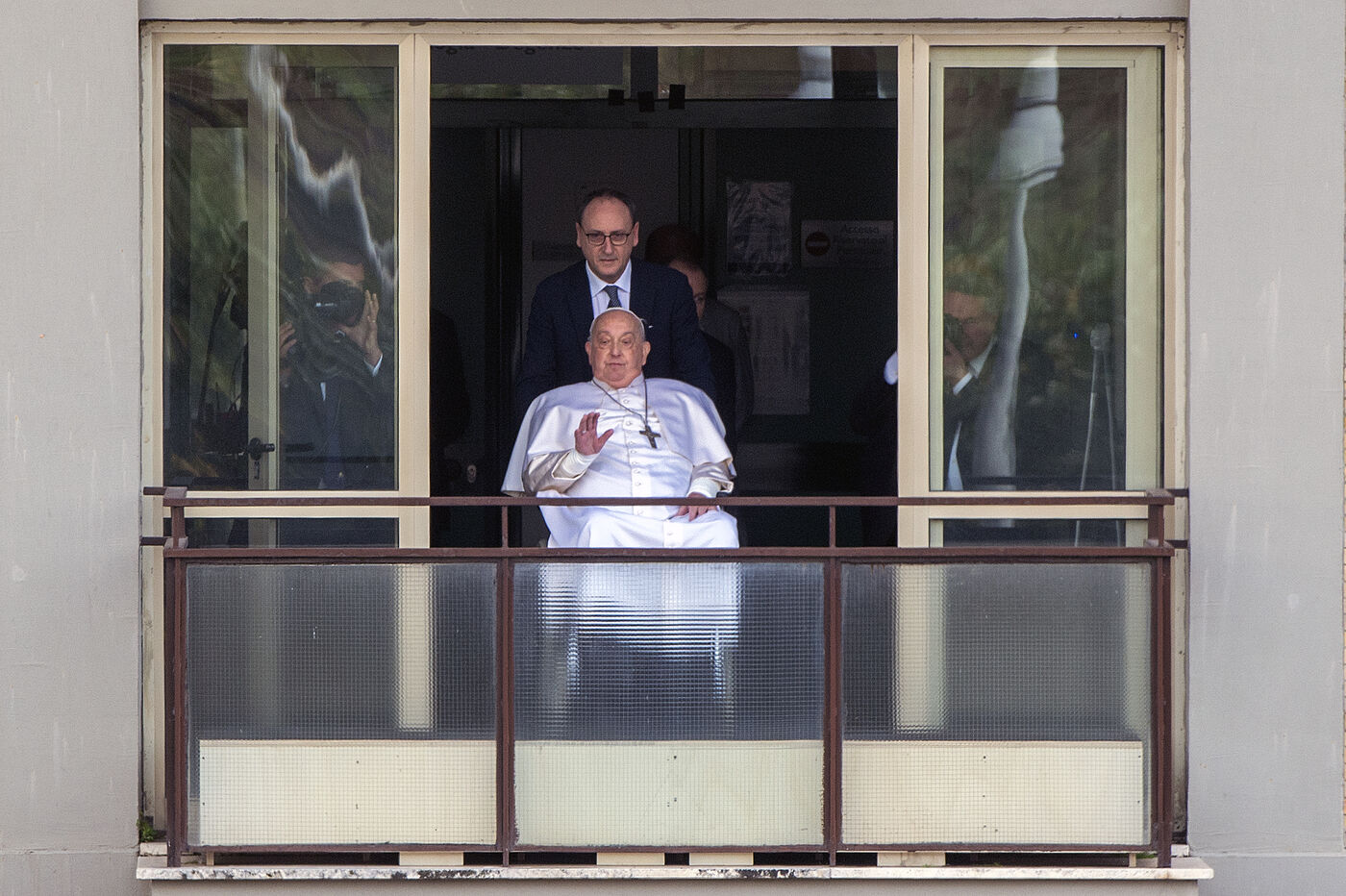 Pope Francis appears at a window of the Agostino Gemelli Polyclinic in Rome in Italy on 23 march 2025. Pope Francis has been treated in this place for bronchitis and bilateral pneumonia since Feb. 14.