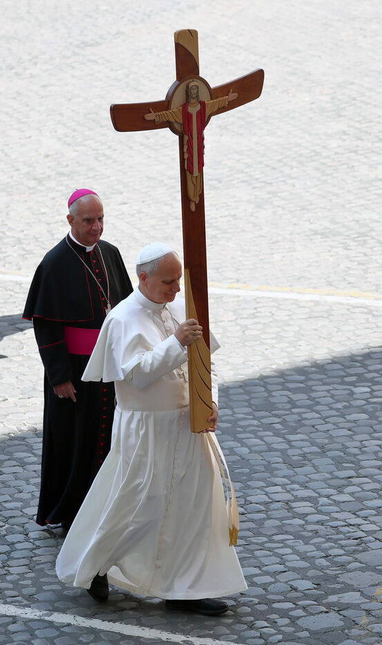 Pope Leo XIV holds a crucifix as he leads a procession
