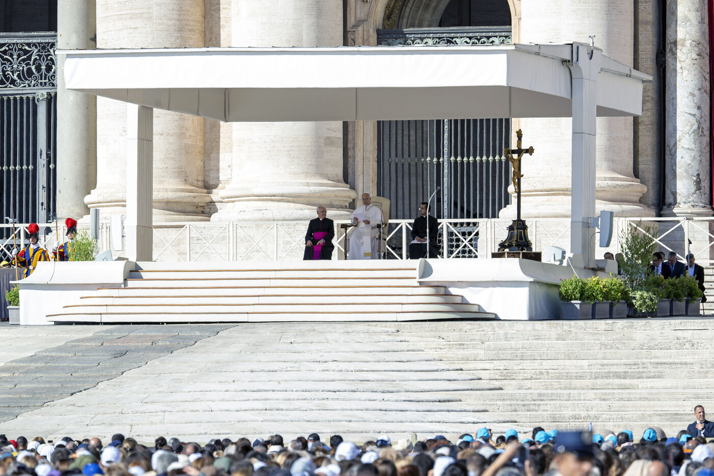 Le pape Leon XIV celebre sur la place Saint-Pierre au Vatican l'audience pour le Jubile des catechistes au Vatican, le samedi 27 septembre 2025.