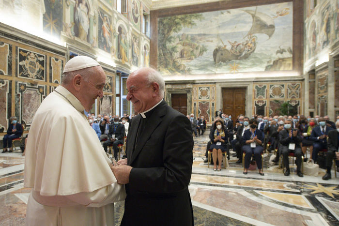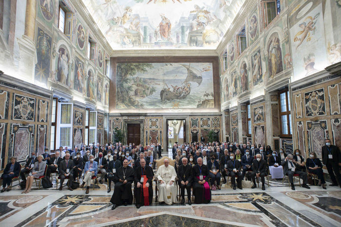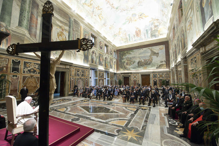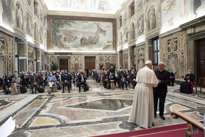 Italy, Rome, Vatican, 2021/09/27. Pope Francis meets in Audience with participants at the Plenary Assembly of the Pontifical Academy for Life in the Vatican. Photograph by Vatican Media / Catholic Press Photo / Hans Lucas. RESTRICTED TO EDITORIAL USE - NO MARKETING - NO ADVERTISING CAMPAIGNS. Italie, Rome, Vatican, 2021/09/27. Le Pape François rencontre en audience les participants à l'Assemblée plénière de l'Académie pontificale pour la vie au Vatican. Photo prise par Vatican Media / Catholic Press Photo / Hans Lucas. RÉSERVÉ À UN USAGE ÉDITORIAL - PAS DE MARKETING - PAS DE CAMPAGNES PUBLICITAIRES.