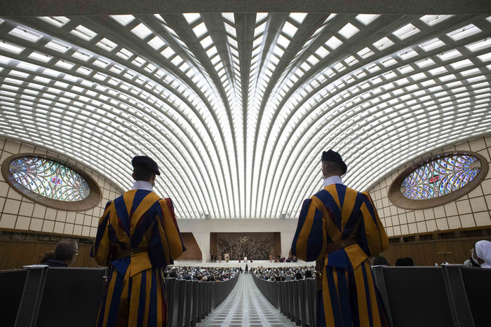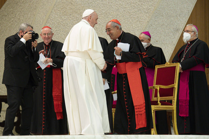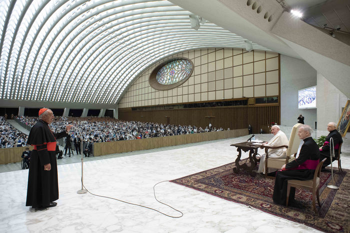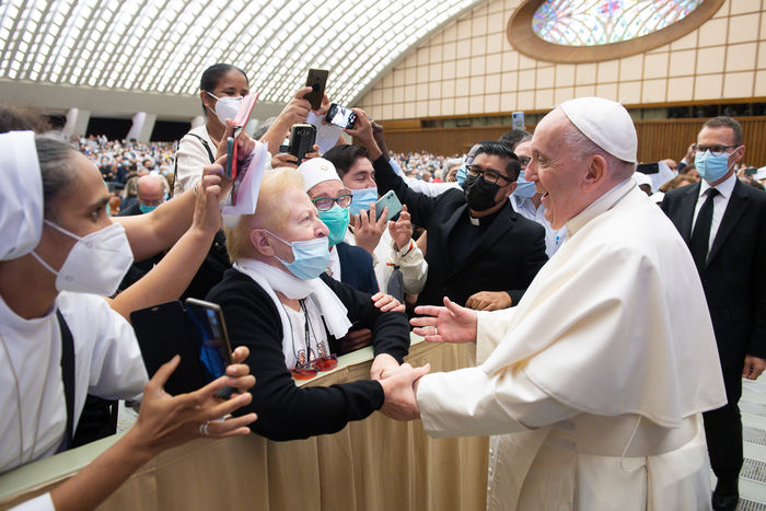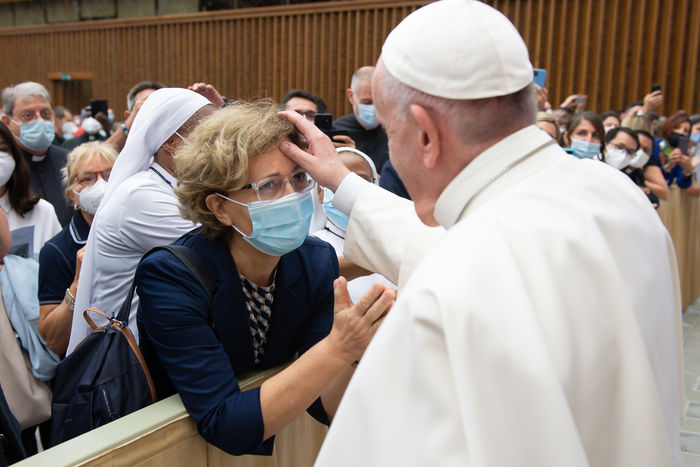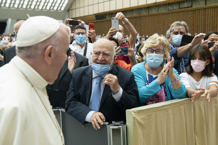 Italy, Rome, Vatican, 21/09/18. Pope Francis during an audience with the faithful of the Diocese of Rome in the Paul VI Hall at the Vatican. Photograph by Vatican Media / Catholic Press Photo / Hans Lucas.