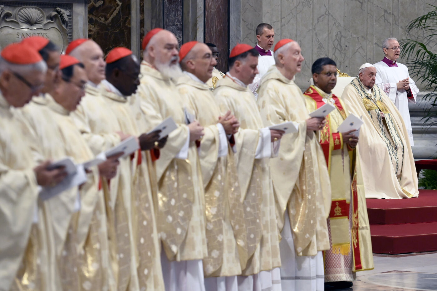 Pope Francis presides over a mass in St. Peter's Basilica with the 21 new cardinals he made on Saturday during a public concistory in Vatican on Sunday, Dec. 8, 2024.