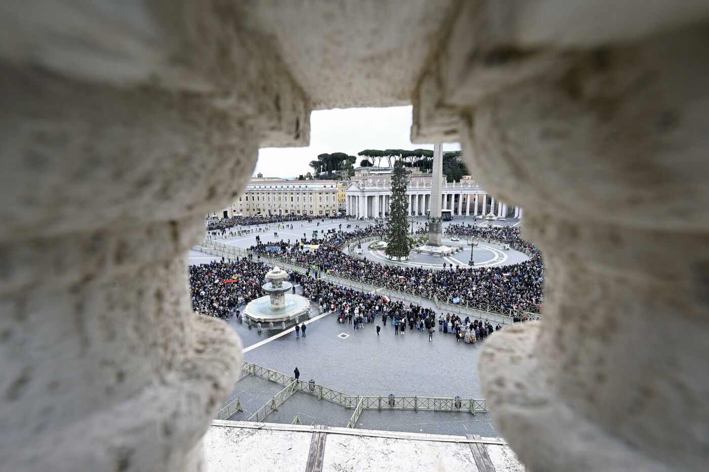 Le pape Francois donne sa benediction aux fideles pendant la priere de l'Angelus sur la place Saint-Pierre au Vatican, 2025/1/12.