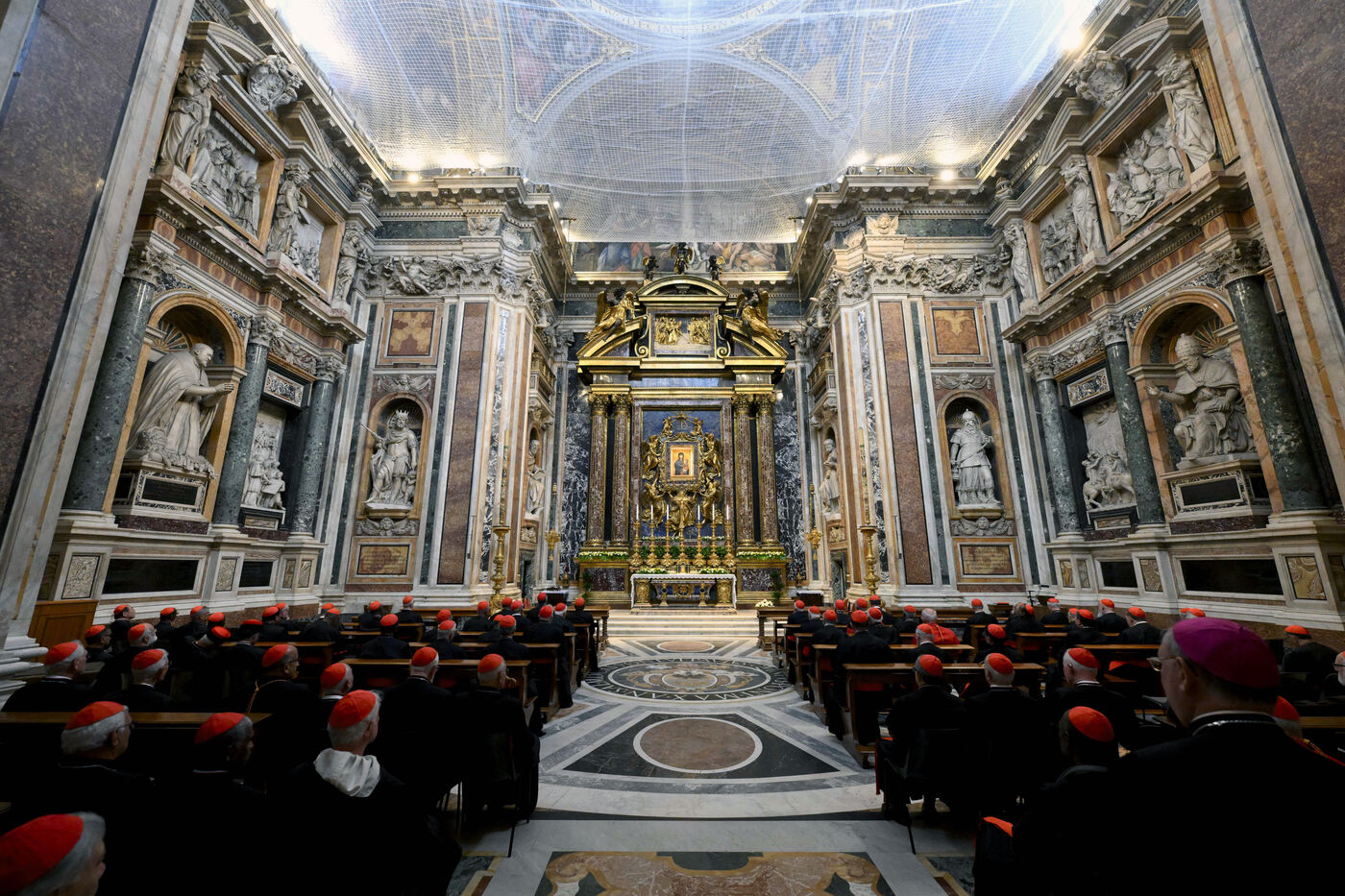 Les cardinaux prient à l'intérieur de la chapelle paulinienne, gardienne de l'icône Salus Populi Romani, à la basilique Sainte-Marie-Majeure au Vatican, le 2025/4/27.