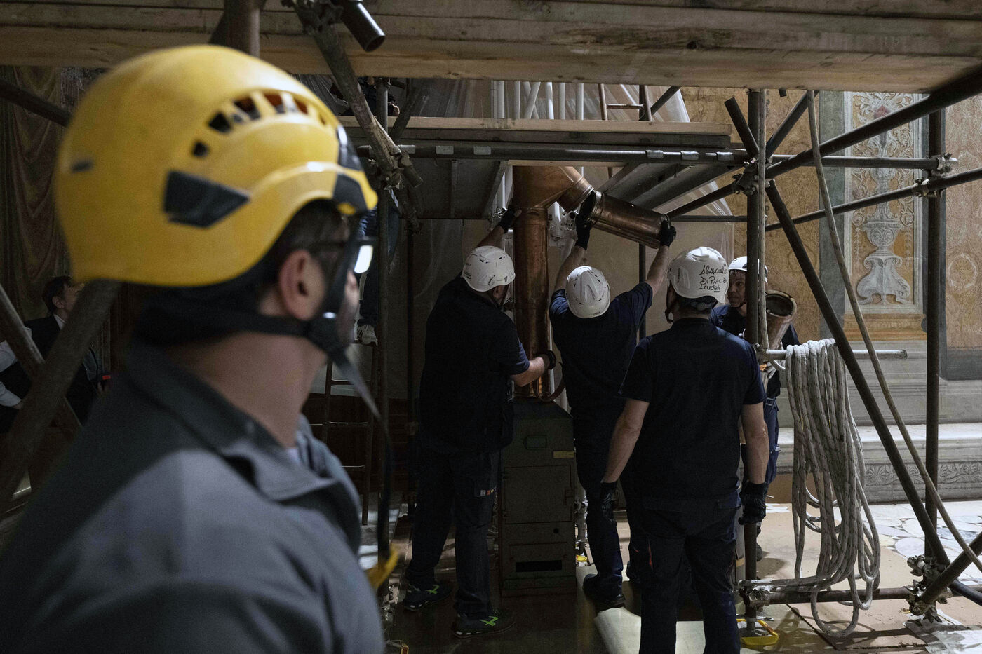 Des pompiers réparent la cheminée sur le toit de la Chapelle Sixtine