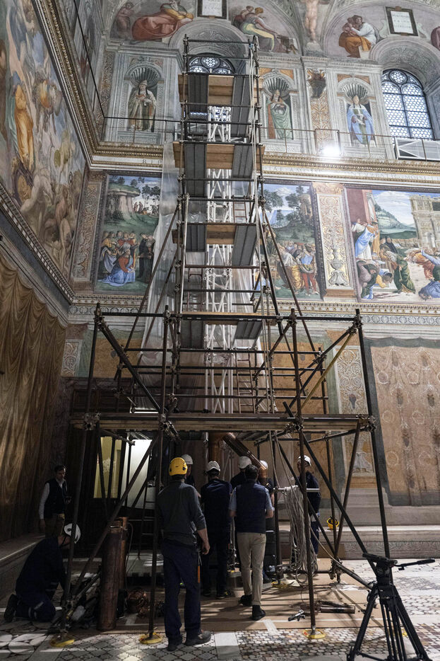 Firefighters fix the chimney on the roof of the Sistine Chapel, where cardinals will gather to elect a new pope, at the Vatican on May 3, 2025. Photograph by Vatican Media / CPP / HANS LUCAS.