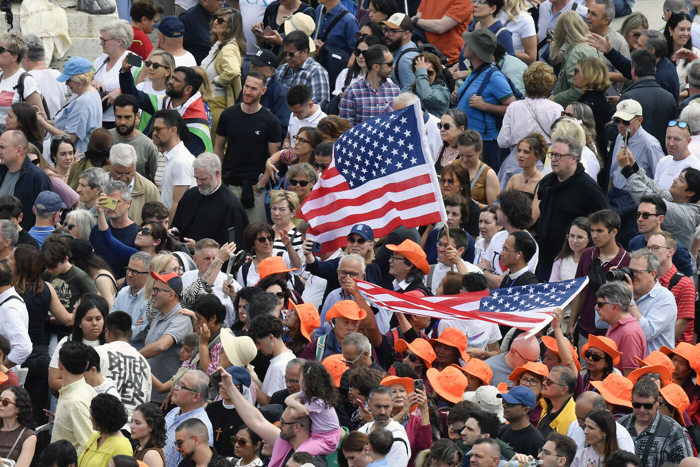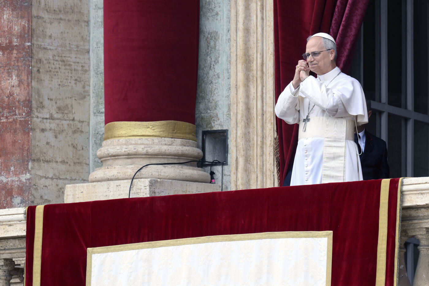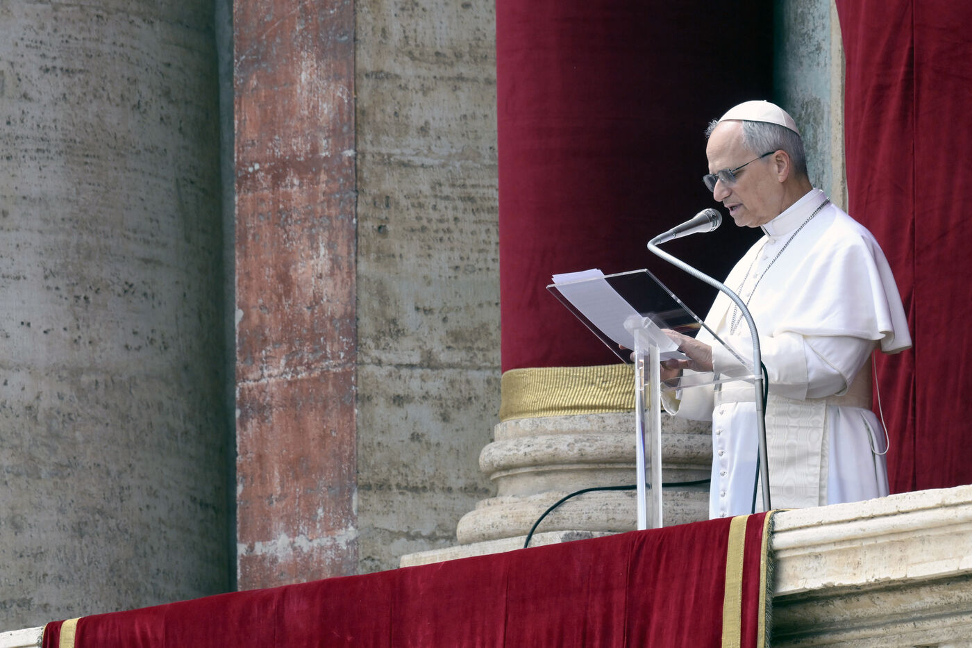 Vatican, 2025/5/11. Le pape Léon XIV pendant sa première prière du Reginal Caeli depuis la loggia centrale de la basilique Saint-Pierre au Vatican.