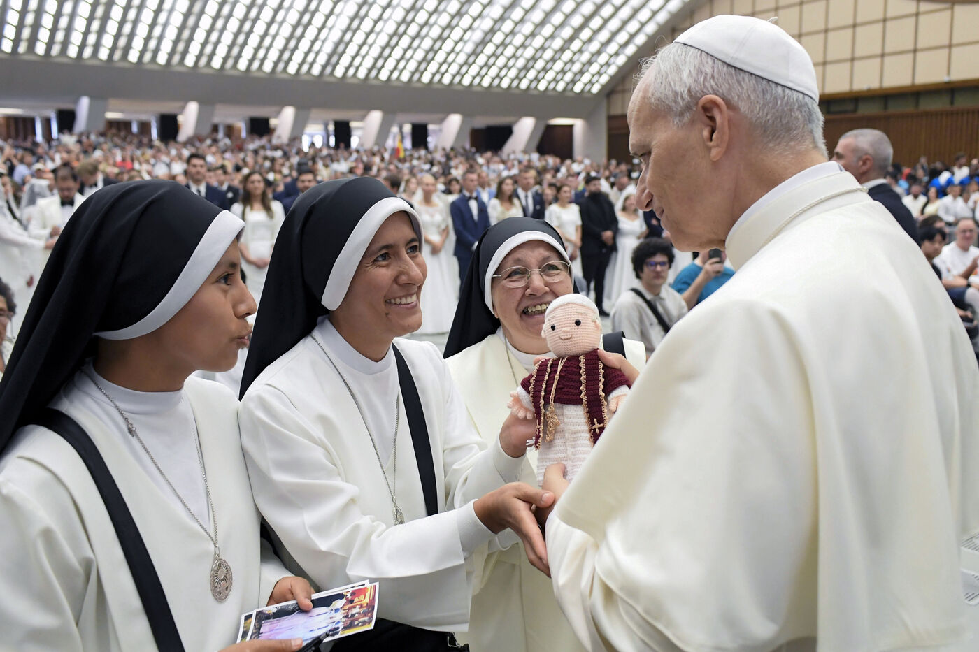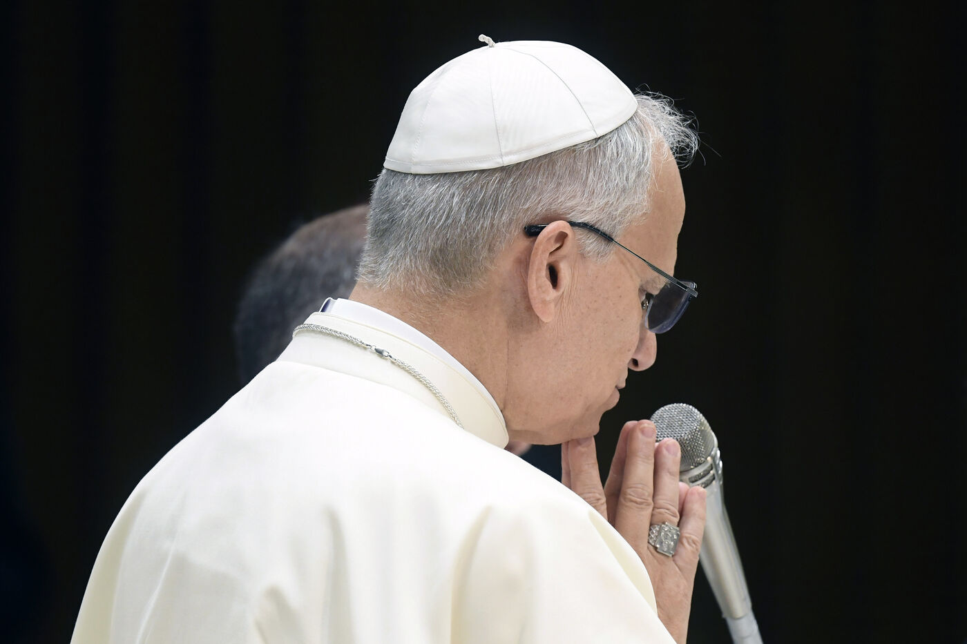Pope Leo XIV during the general audience in St Peter's Basilica at the Vatican on 2025/8/ 13. Pope Leo XIV's General Audience is held in the Paul VI Hall due to the extreme Roman heat at the Vatican.