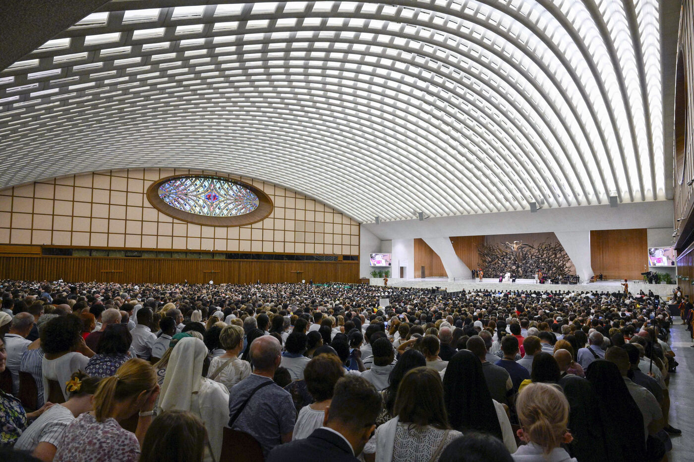 Le pape Léon XIV dirige son audience hebdomadaire dans la salle Paul VI au Vatican, le 2025/8/20.