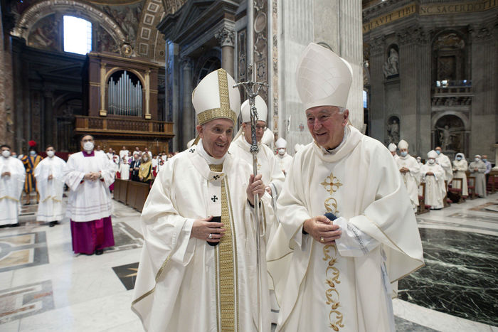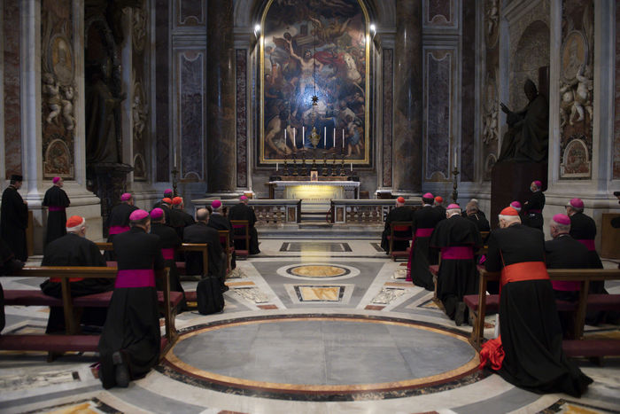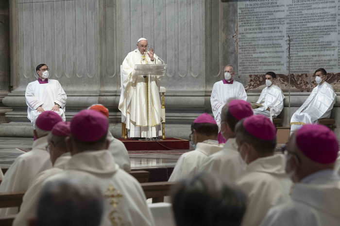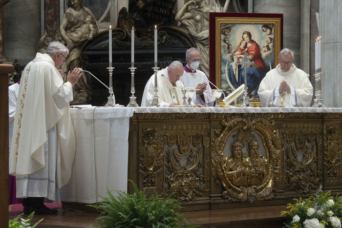Italy, Rome, Vatican, 2021/09/23. Pope Francis celebrates Mass within the Plenary Council of the European Bishops' Conferences, in St. Peter's Basilica at the Vatican. Photograph by Vatican Pool / Catholic Press Photo / Hans Lucas.