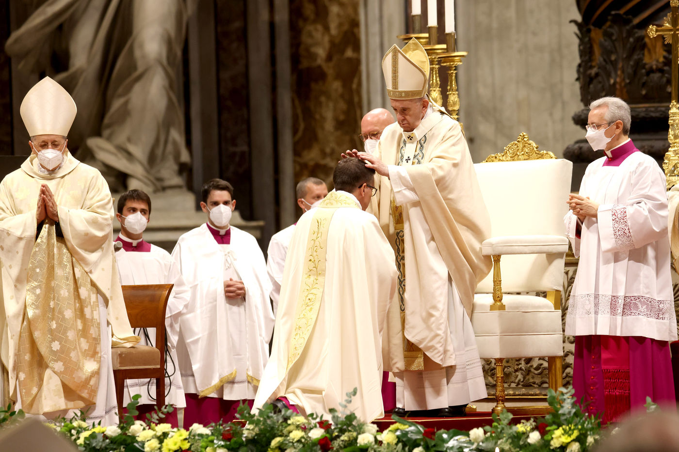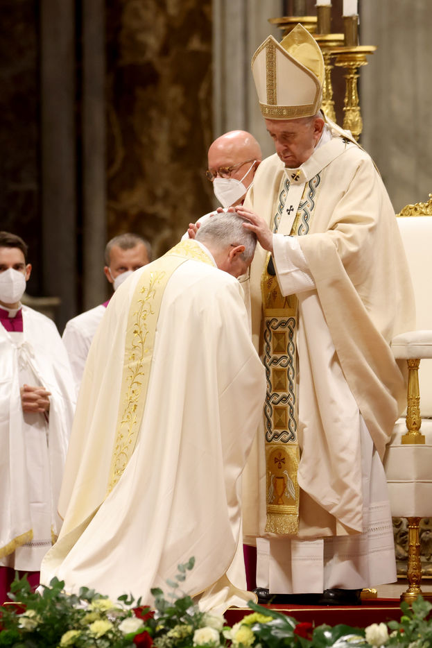 Italy, Rome, Vatican, 2021/10/17. Pope Francis celebrates the Holy Mass, during which he conferred Episcopal Ordination on Mgr. Guido Marini, Bishop of Tortona, and Mgr. Andres Gabriel Ferrada Moreira, Secretary of the Congregation for the Clergy, in St Peter's Basilica. Photograph by Franco Origlia / Vatican Pool / CPP / HANS LUCAS.