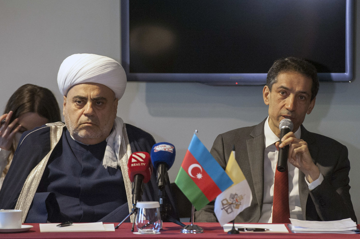 Italie, Rome, Vatican, 22/01/17. Sheikh ul-Islam Allahchukur Pashazadé, Chef de la Direction des Musulmans du Caucase et Rahman Sahib oglu Mustafayev, Ambassadeur d'Azerbaïdjan auprès du Saint-Siège, s'expriment lors de la conférence de presse à l'occasion de la visite officielle au Saint-Siège de la délégation interreligieuse de la République d'Azerbaïdjan, à l'Hôtel Agrippina.