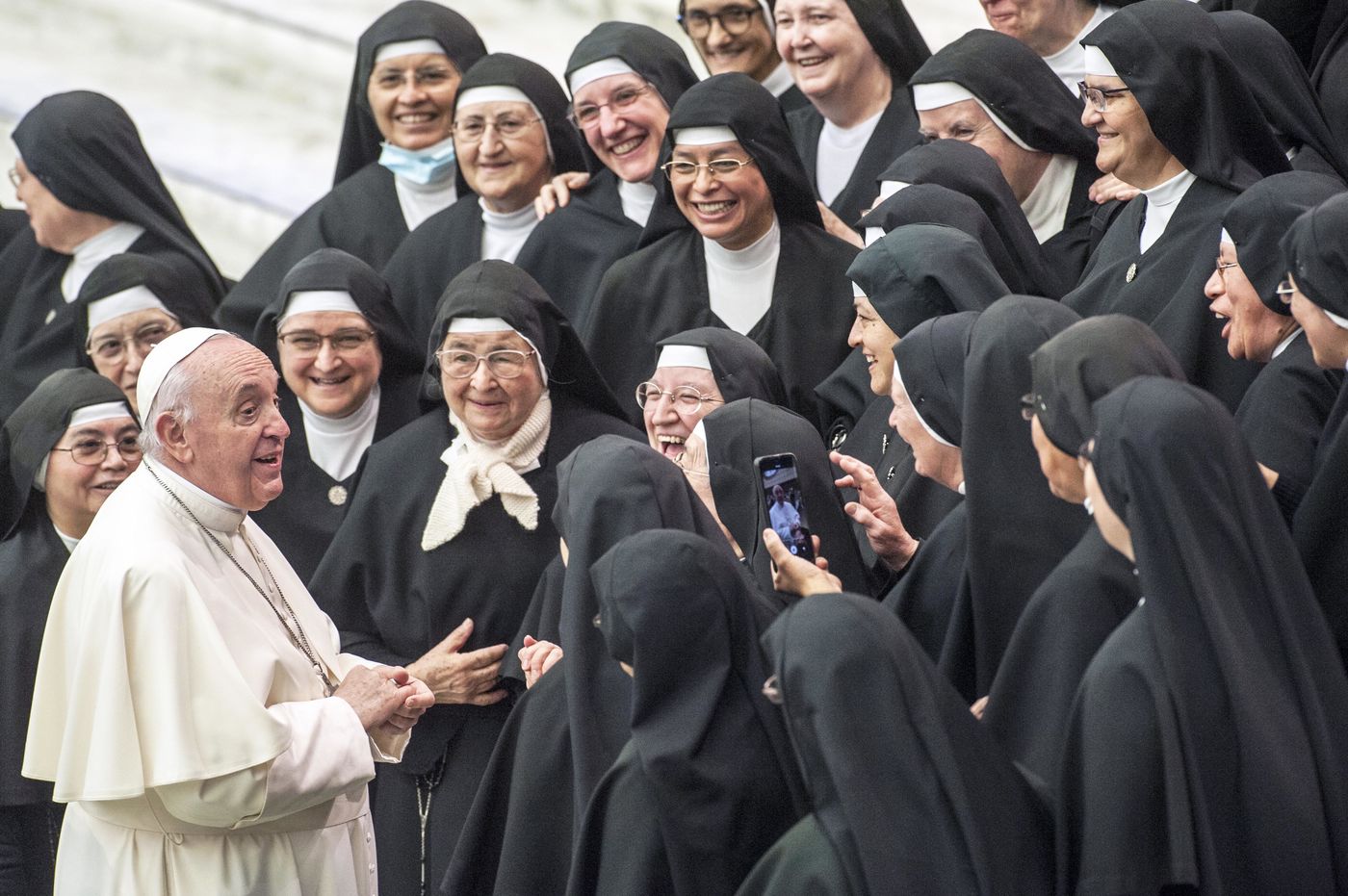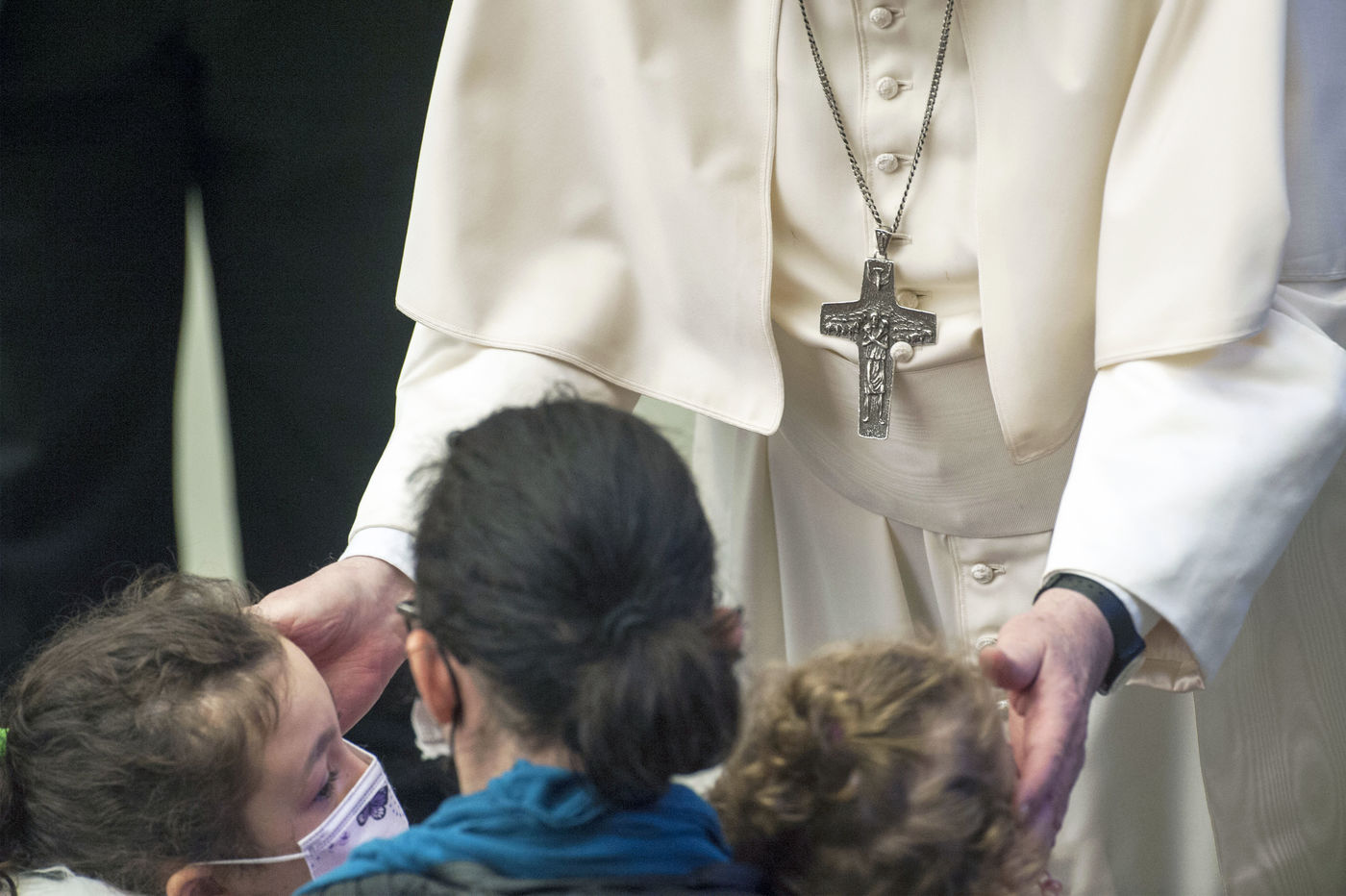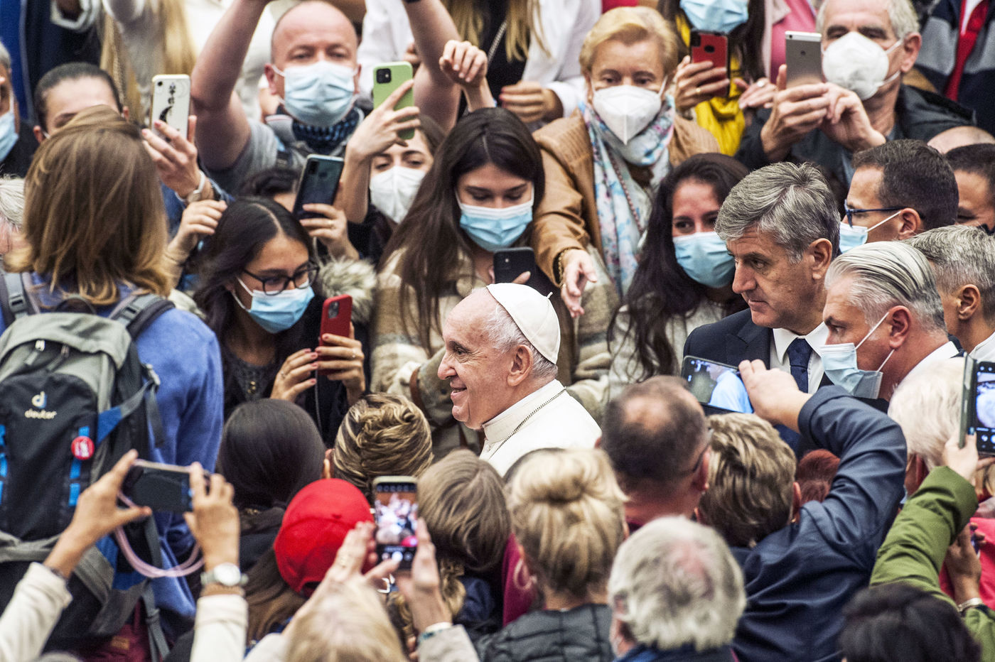 Italy, Rome, Vatican, 2021/10/20. Pope Francis gives his blessing during his weekly general audience in the Pope Paul VI hall at the Vatican. Photograph by Massimiliano Migliorato / Catholic Press Photo / HANS LUCAS.