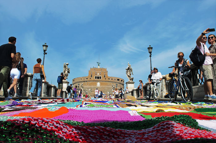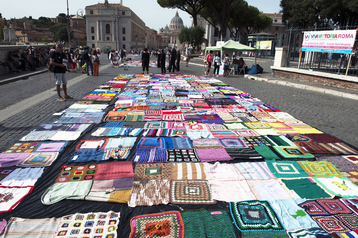 Italy, Rome, Vatican, 2021/09/25. Castel Sant'Angelo to say together NO to violence against women. The event VIVA VITTORIA - ROME, an installation of 2,100 square meters of blankets made by over 6,000 women and a few men. The blankets will be the subject of donations that will go to two projects that help women in need: the first is DIFFERENCE WOMEN and helps disabled women victims of violence, the second is a structure that helps homeless women to recover their dignity.