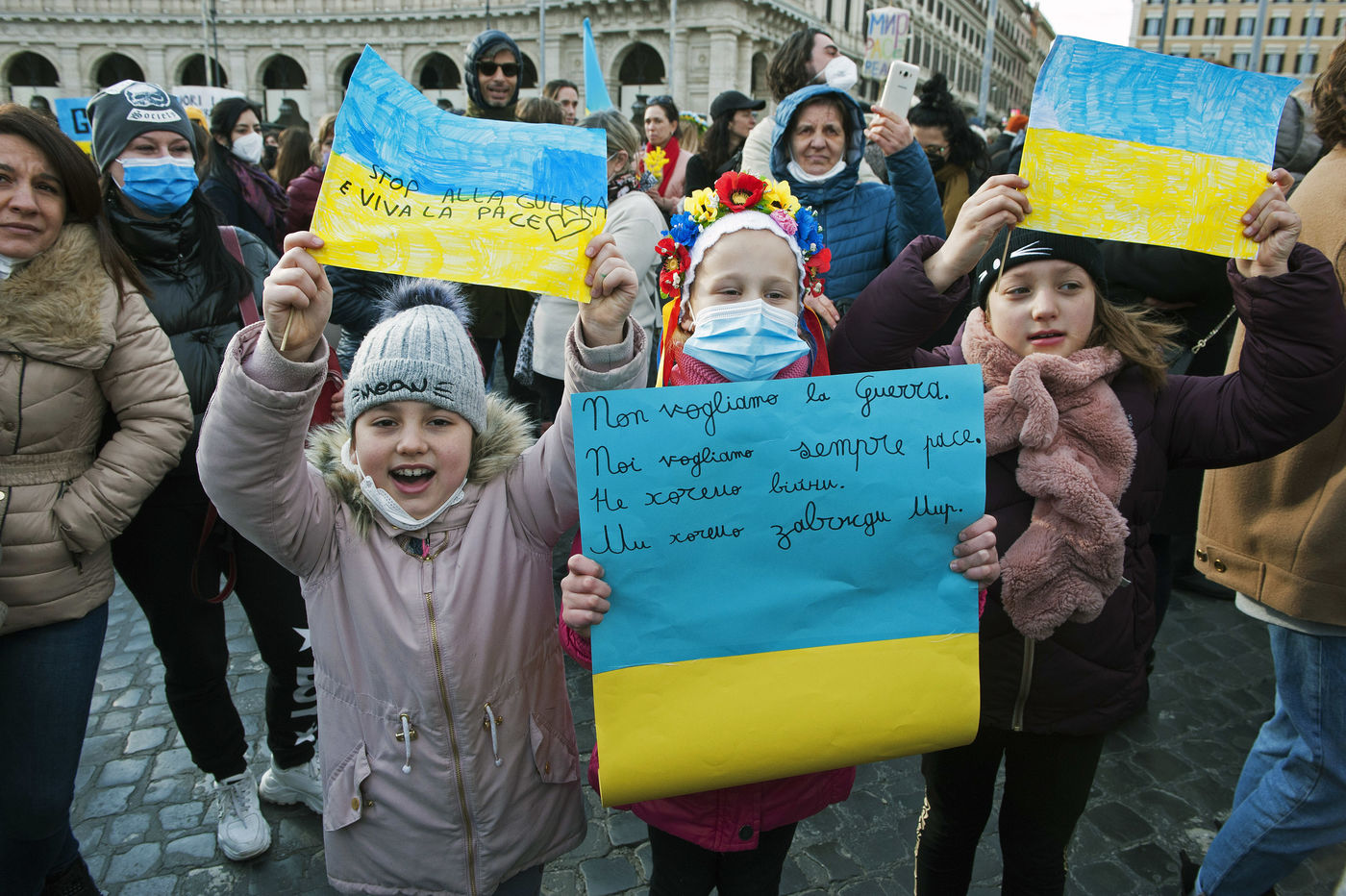 Italy, Rome, 2022/02/27. People hold Ukrainian flags as they demonstrate against the war in Ukraine, in Rome.