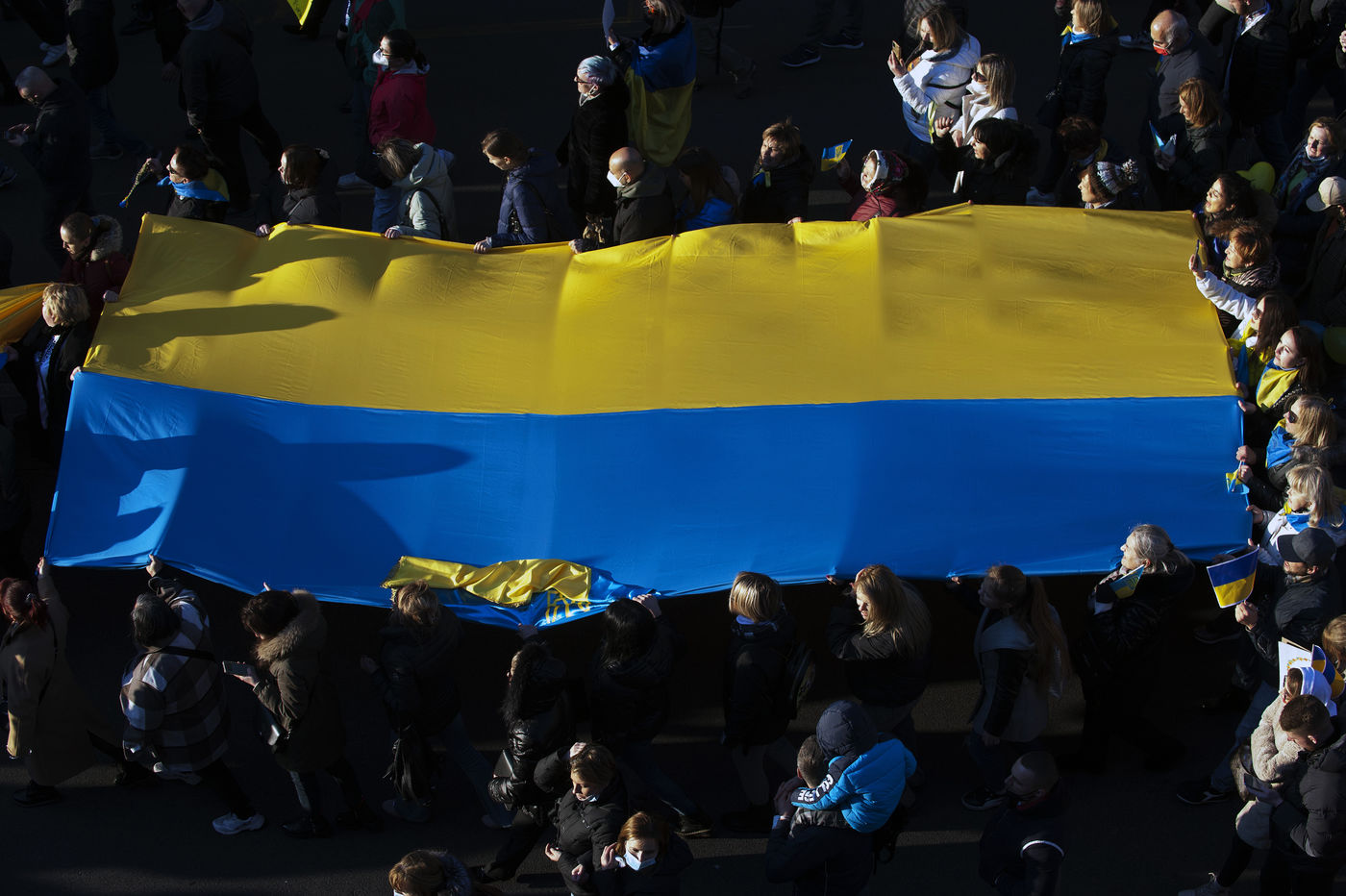 Des personnes manifestent avec des drapeaux ukrainiens