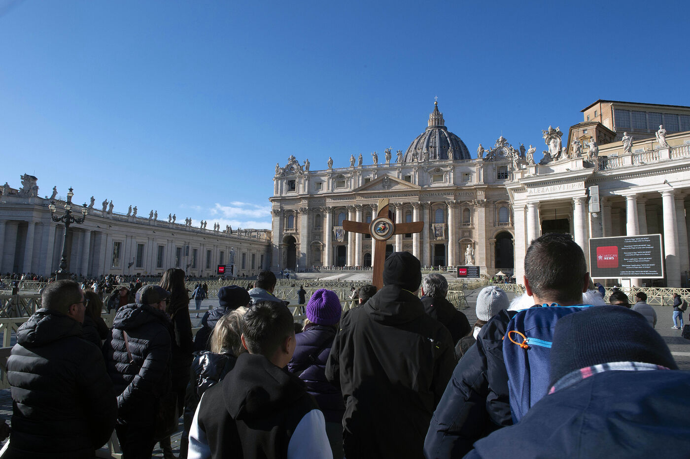 Le pape François donne sa bénédiction aux fidèles pendant la prière de l'Angélus sur la place Saint-Pierre au Vatican, 2024/12/26.