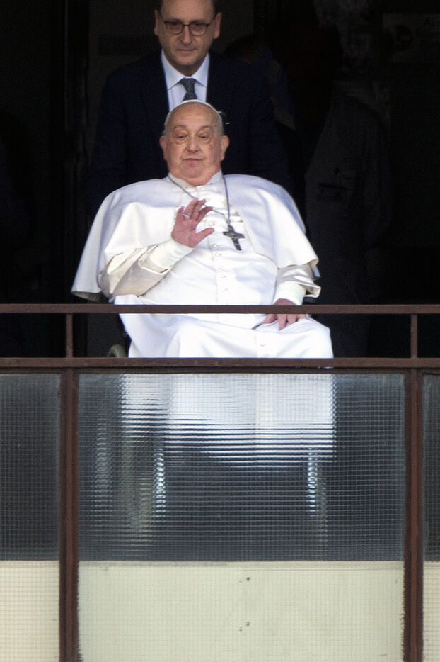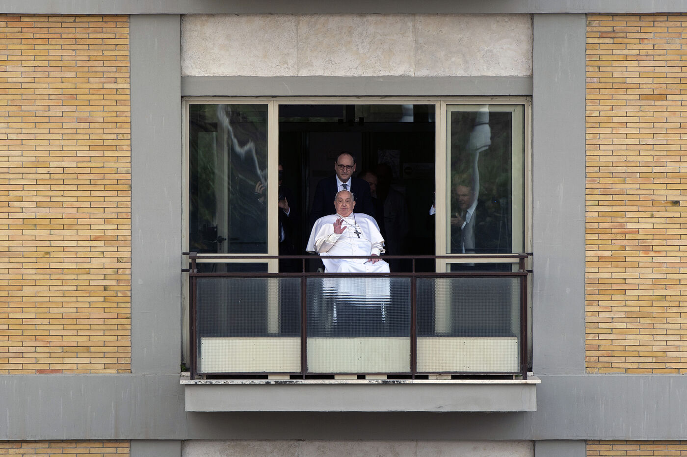 Pope Francis appears at a window of the Agostino Gemelli Polyclinic in Rome in Italy on 23 march 2025. Pope Francis has been treated in this place for bronchitis and bilateral pneumonia since Feb. 14.