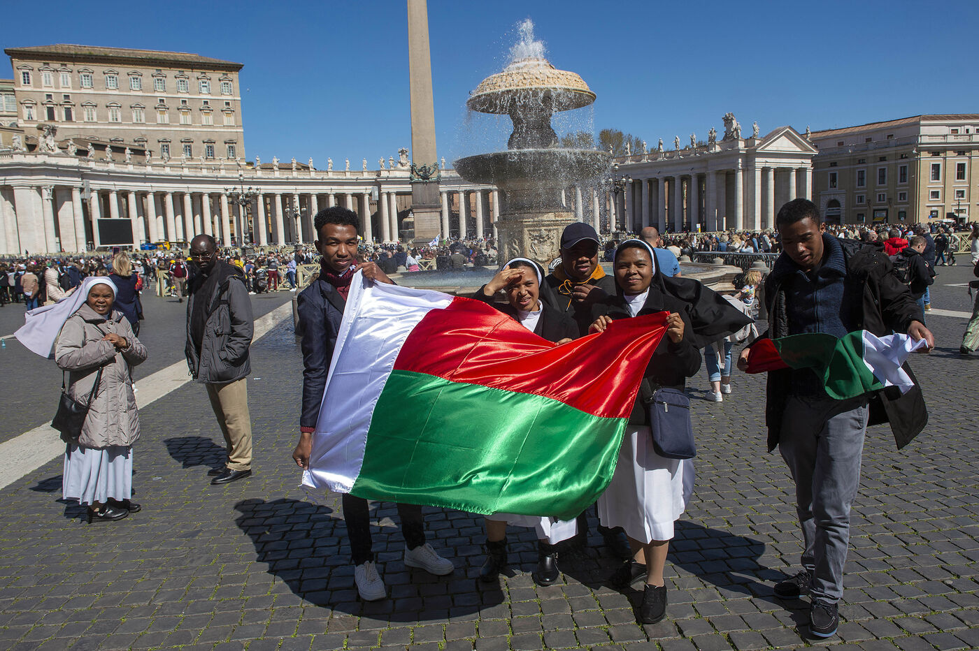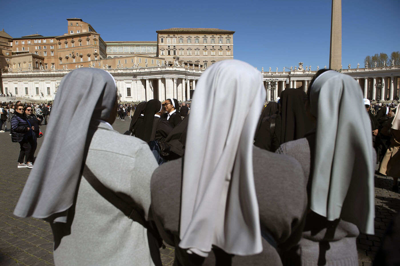 Des fidèles se promènent sur la place Saint-Pierre