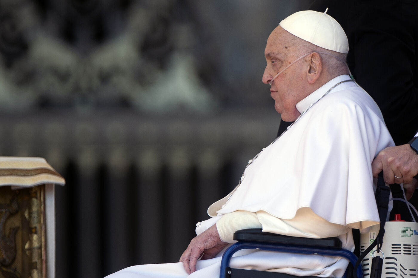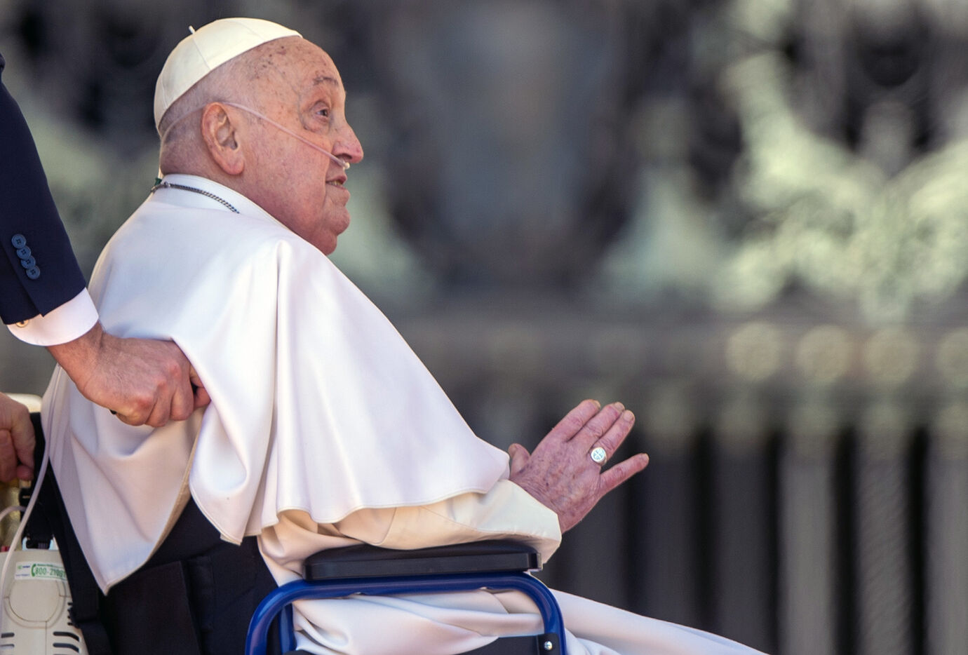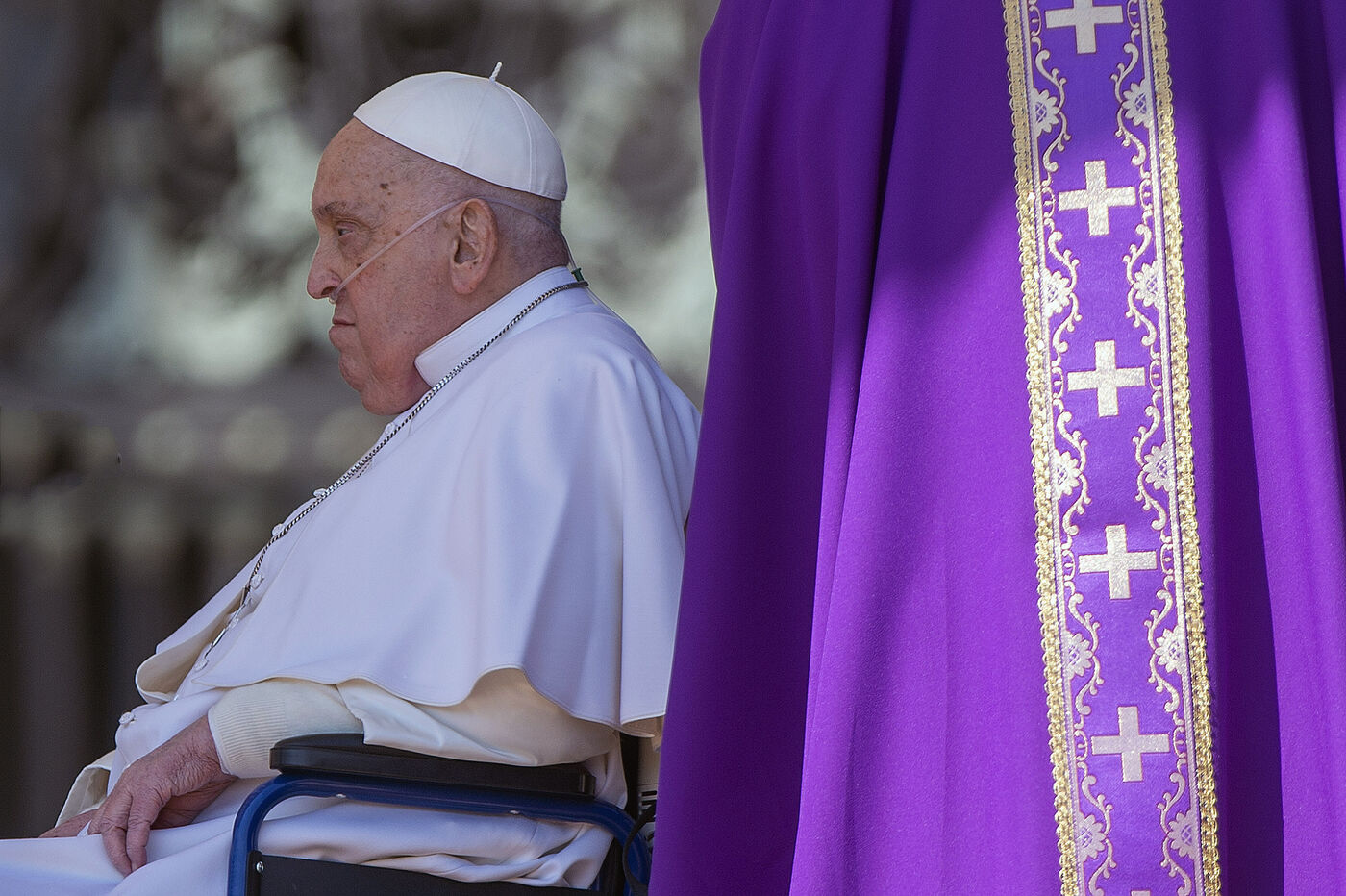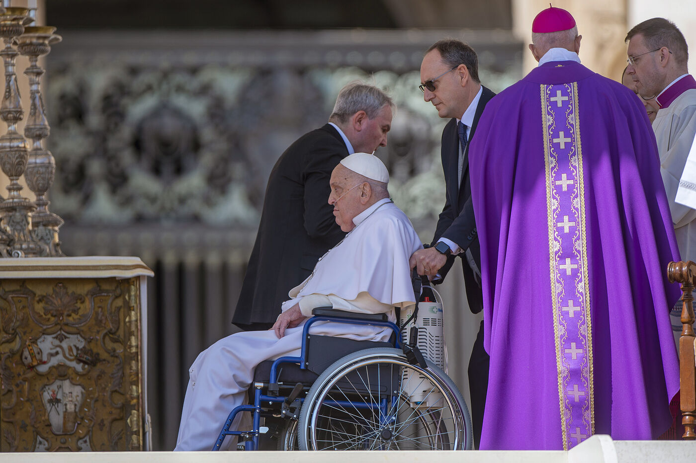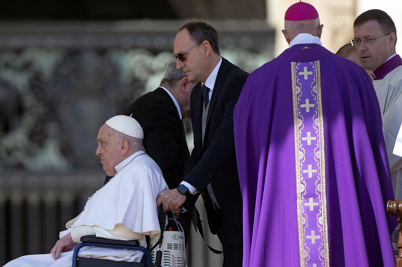 L'archevêque Salvatore Fisichella célèbre une messe sur la place Saint-Pierre au Vatican, dans le cadre du jubilé des malades et des travailleurs de la santé, Vatican, 2025/4/6. Le pape François arrive à la fin de la messe.