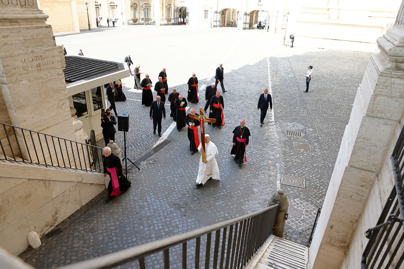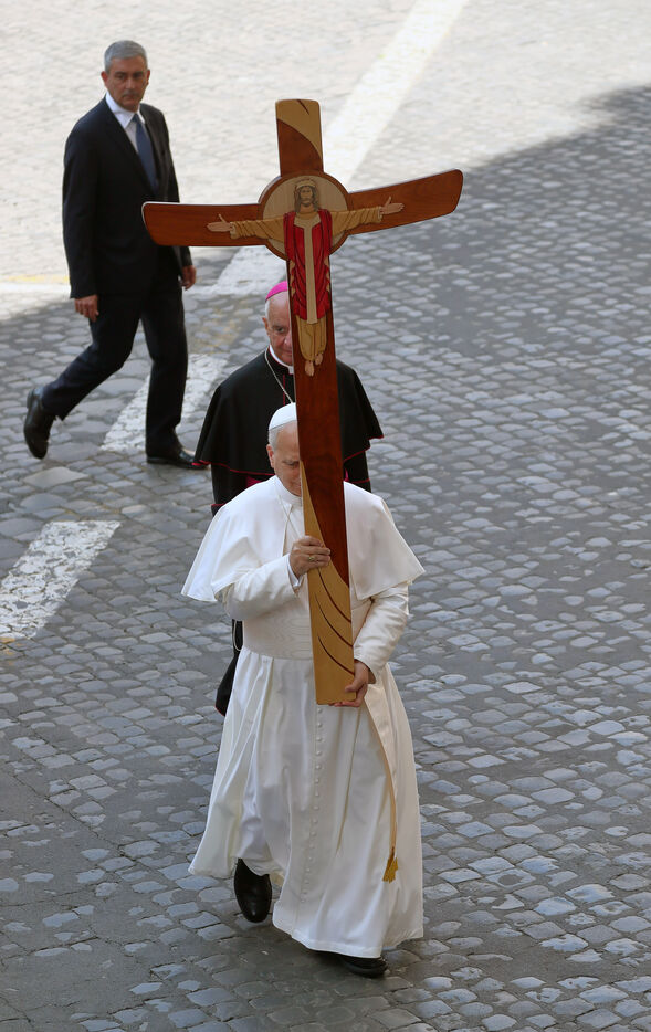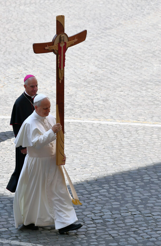 Pope Leo XIV holds a crucifix as he leads a procession