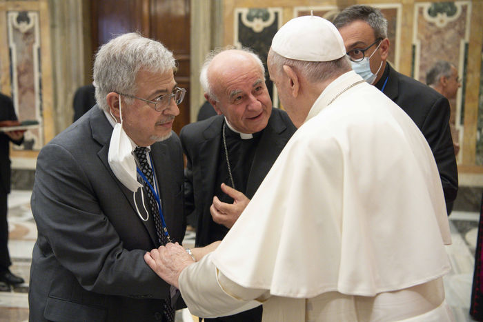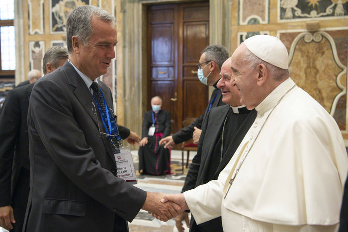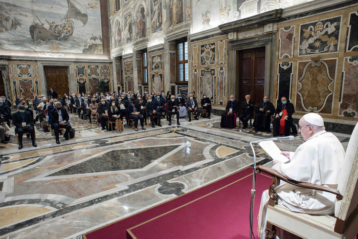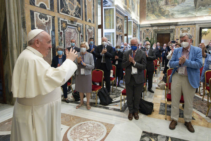 Italy, Rome, Vatican, 2021/09/27. Pope Francis meets in Audience with participants at the Plenary Assembly of the Pontifical Academy for Life in the Vatican. Photograph by Vatican Media / Catholic Press Photo / Hans Lucas. RESTRICTED TO EDITORIAL USE - NO MARKETING - NO ADVERTISING CAMPAIGNS. Italie, Rome, Vatican, 2021/09/27. Le Pape François rencontre en audience les participants à l'Assemblée plénière de l'Académie pontificale pour la vie au Vatican. Photo prise par Vatican Media / Catholic Press Photo / Hans Lucas. RÉSERVÉ À UN USAGE ÉDITORIAL - PAS DE MARKETING - PAS DE CAMPAGNES PUBLICITAIRES.