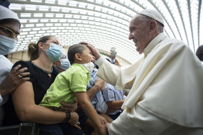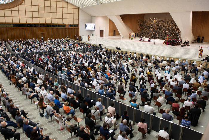 Italy, Rome, Vatican, 21/09/18. Pope Francis during an audience with the faithful of the Diocese of Rome in the Paul VI Hall at the Vatican. Photograph by Vatican Media / Catholic Press Photo / Hans Lucas.
