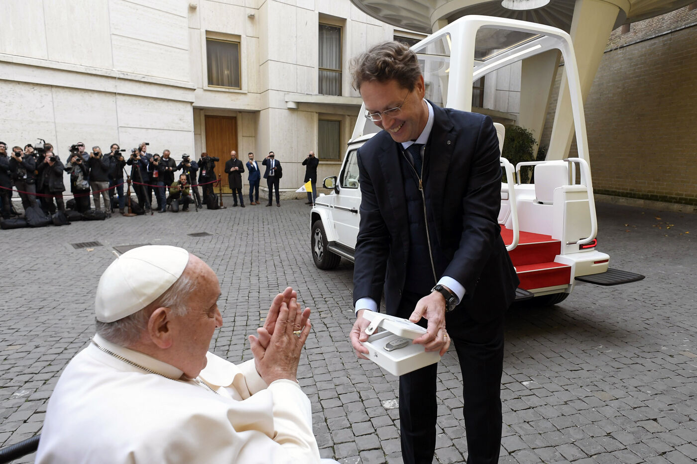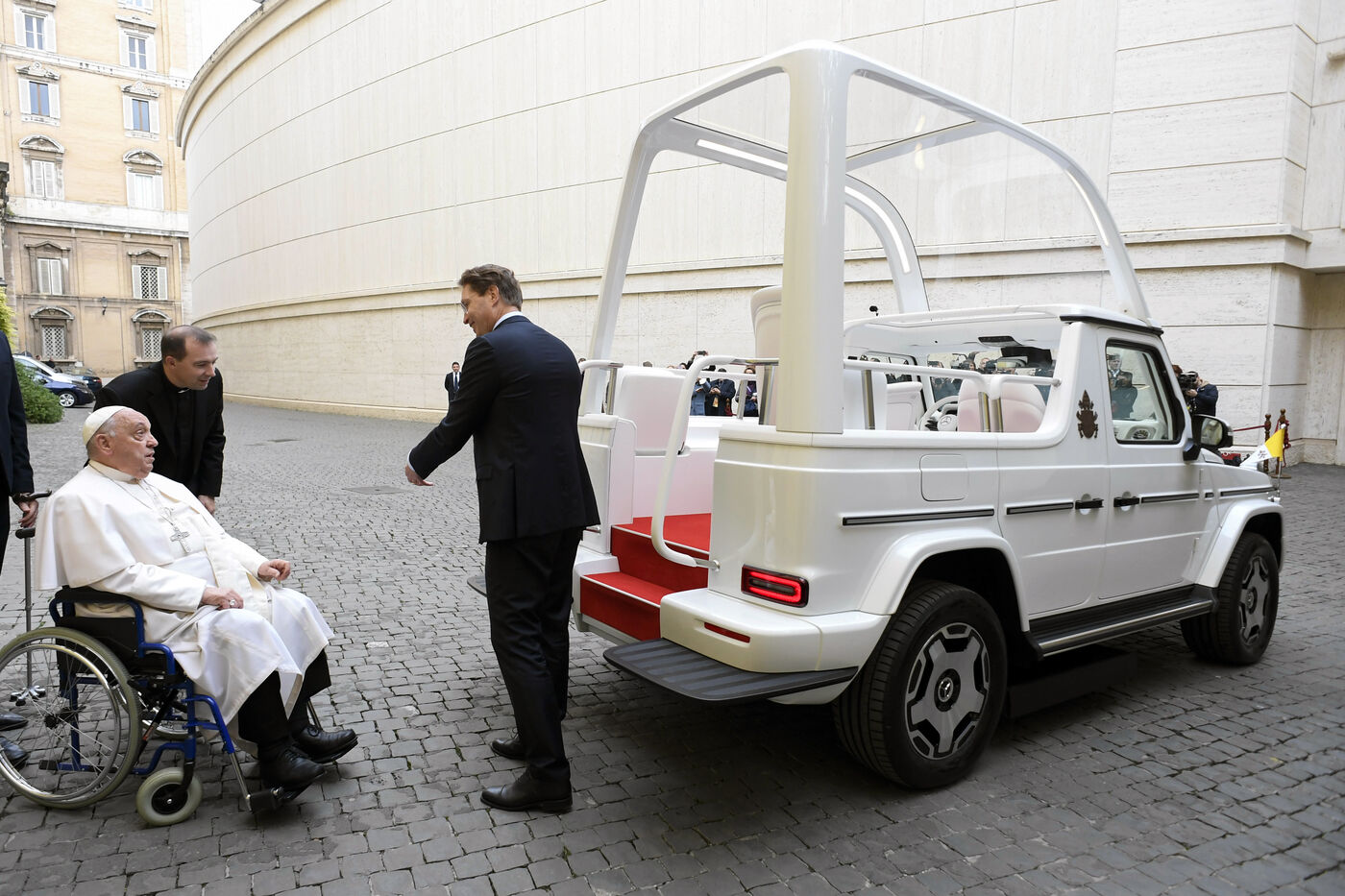Pope Francis is presented a new fully electric popemobile at the Vatican on 2024/12/4.