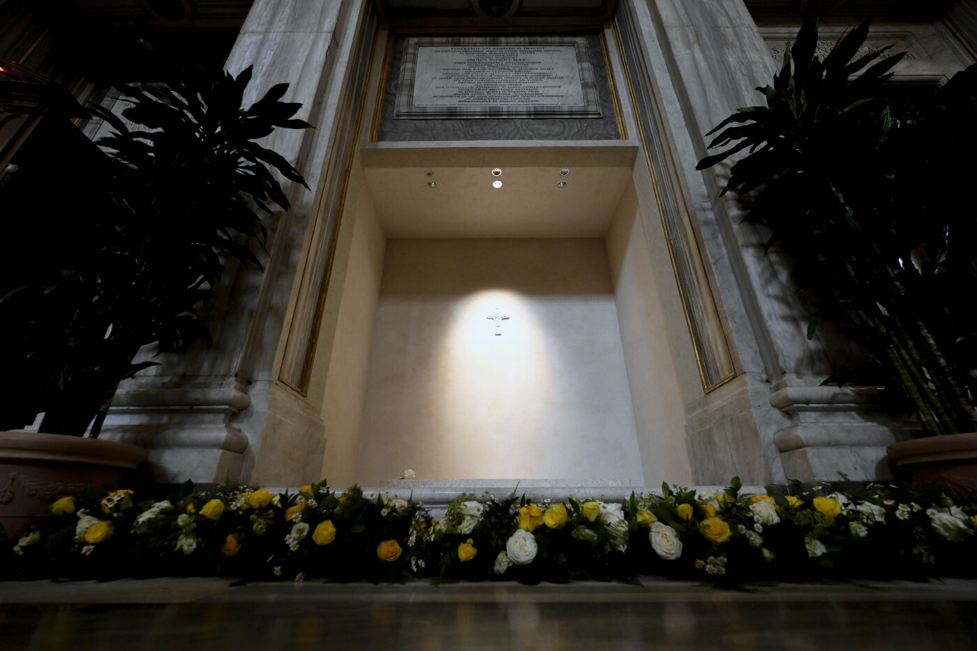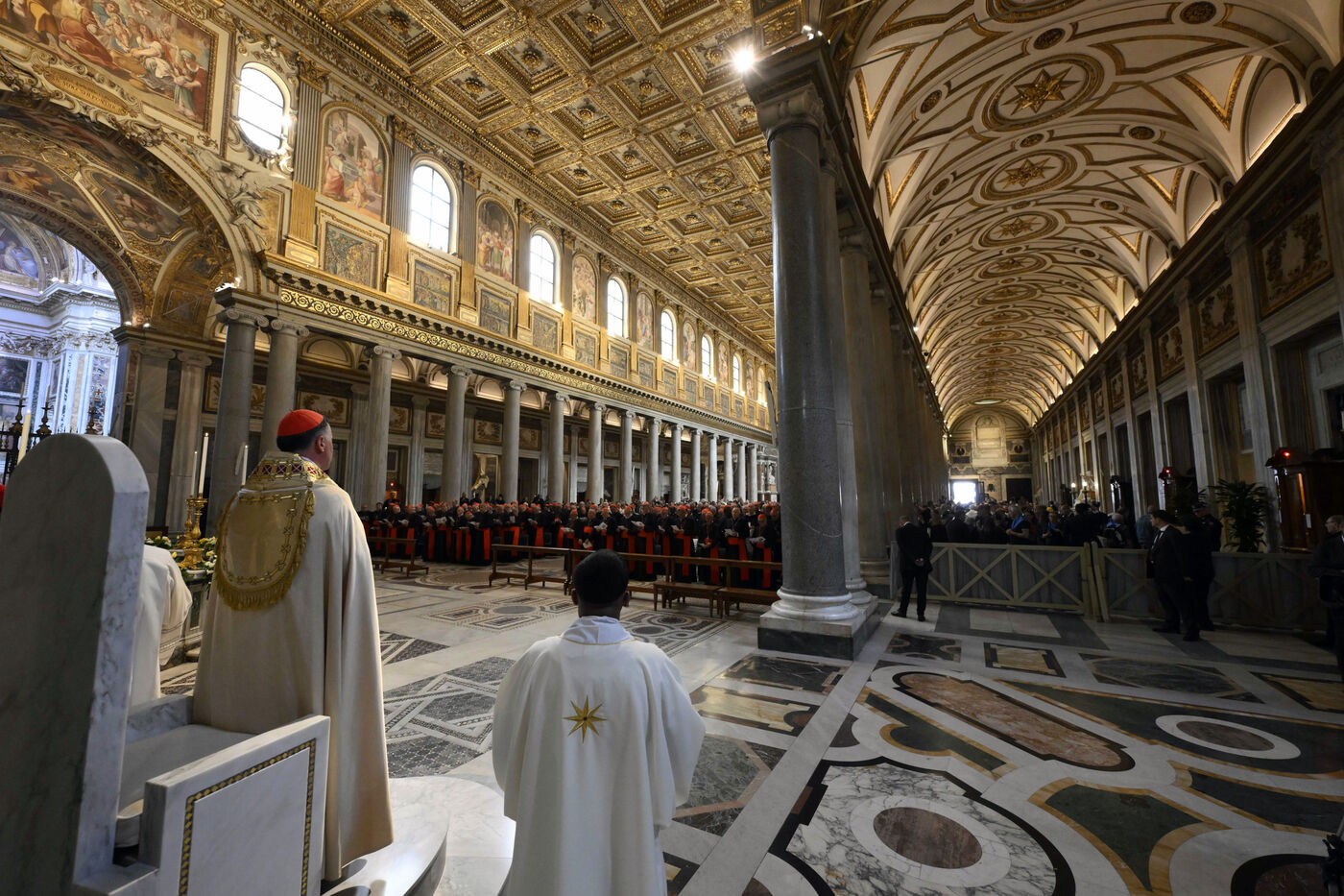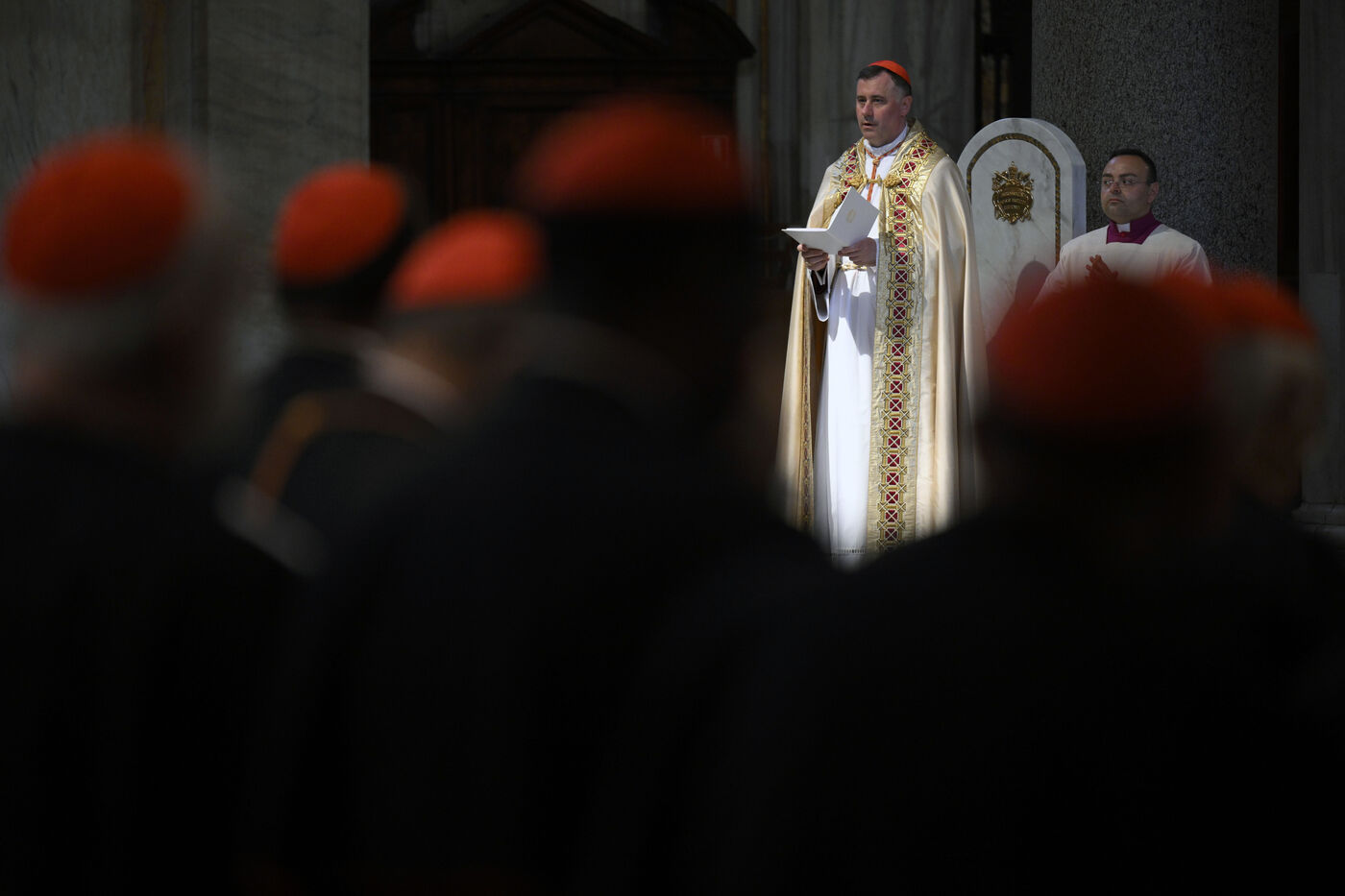 Les cardinaux prient à l'intérieur de la chapelle paulinienne, gardienne de l'icône Salus Populi Romani, à la basilique Sainte-Marie-Majeure au Vatican, le 2025/4/27.