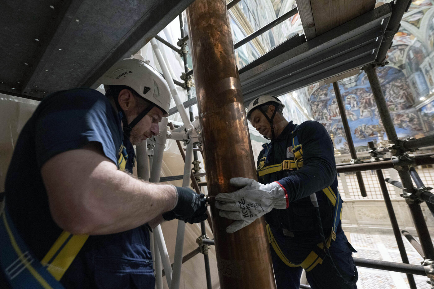Des pompiers réparent la cheminée sur le toit de la Chapelle Sixtine