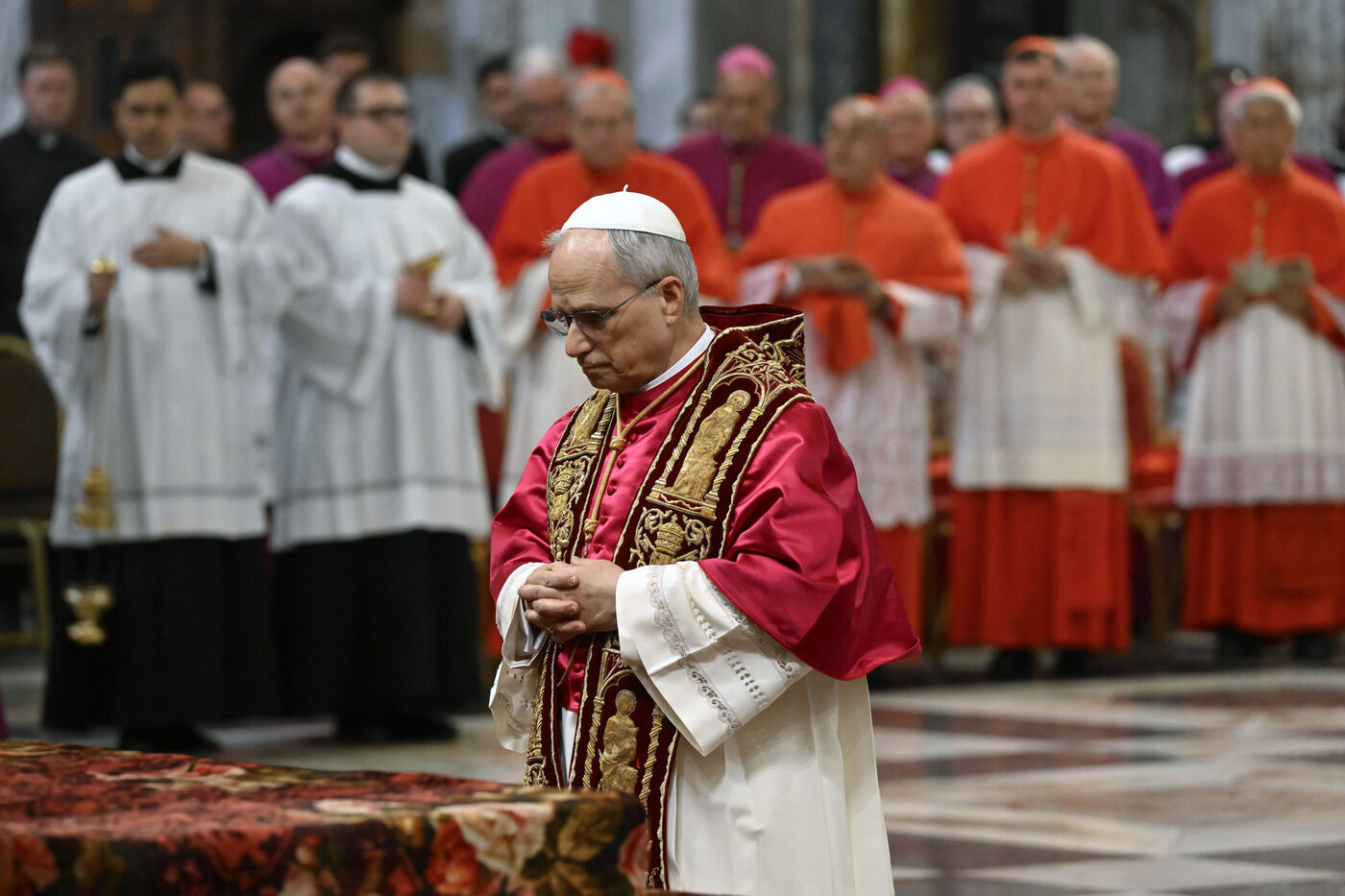 Le pape Léon XIV visite le tombeau de saint Paul à la basilique Saint-Paul-hors-les-murs de Rome en Italie le 2025/5/20.
