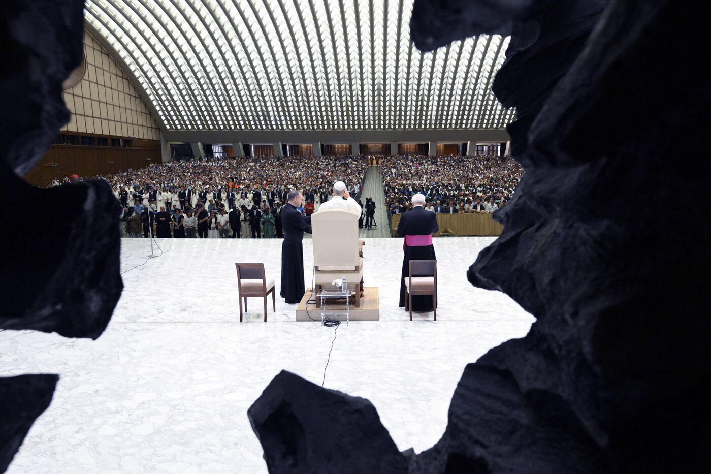 Pope Leo XIV during the general audience in St Peter's Basilica at the Vatican on 2025/8/ 13. Pope Leo XIV's General Audience is held in the Paul VI Hall due to the extreme Roman heat at the Vatican.