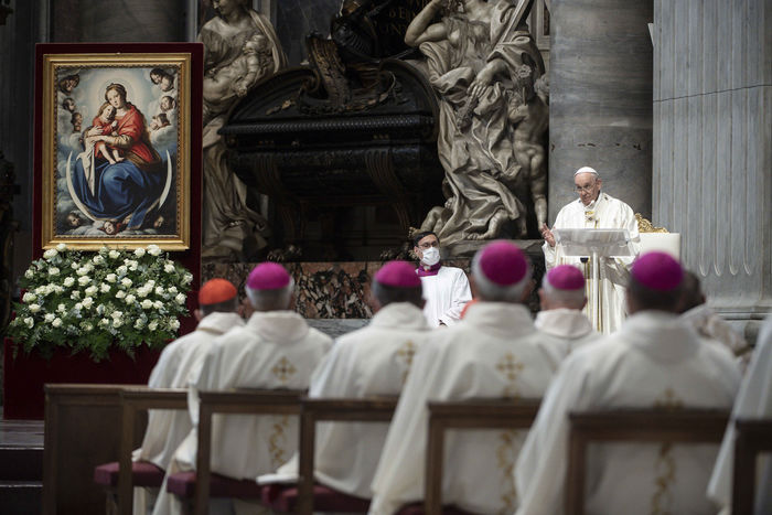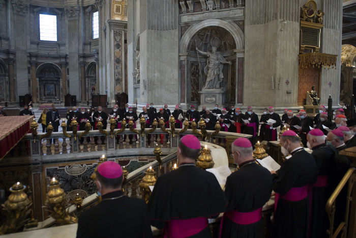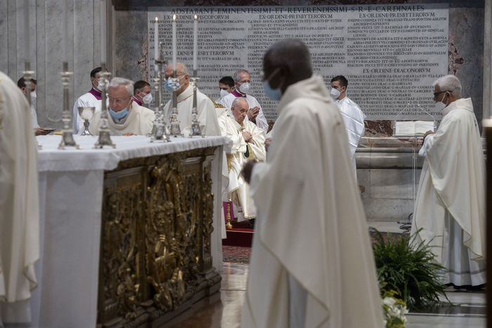 Italy, Rome, Vatican, 2021/09/23. Pope Francis celebrates Mass within the Plenary Council of the European Bishops' Conferences, in St. Peter's Basilica at the Vatican. Photograph by Vatican Pool / Catholic Press Photo / Hans Lucas.