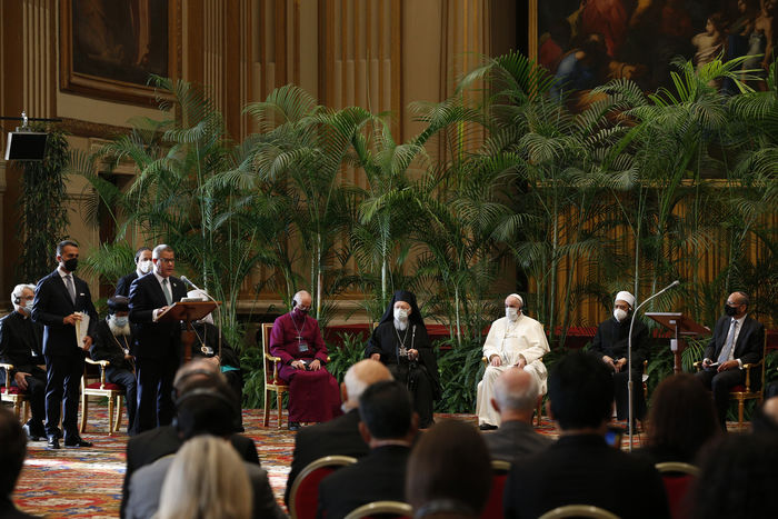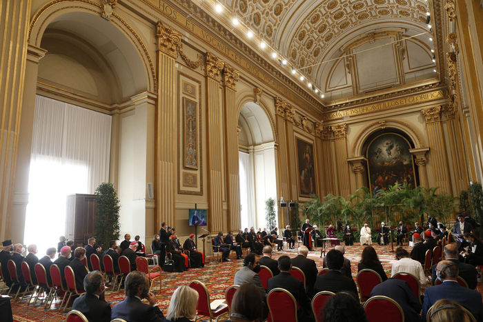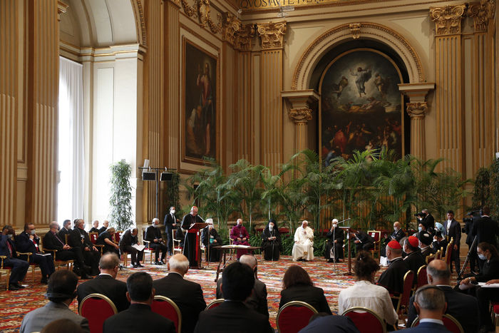 Italy, Rome, Vatican, 2021/10/04. Pope Francis during the meeting "Faith and Science: Towards COP26" at the Apostolic Palace, Aula della Benedizione at the Vatican.