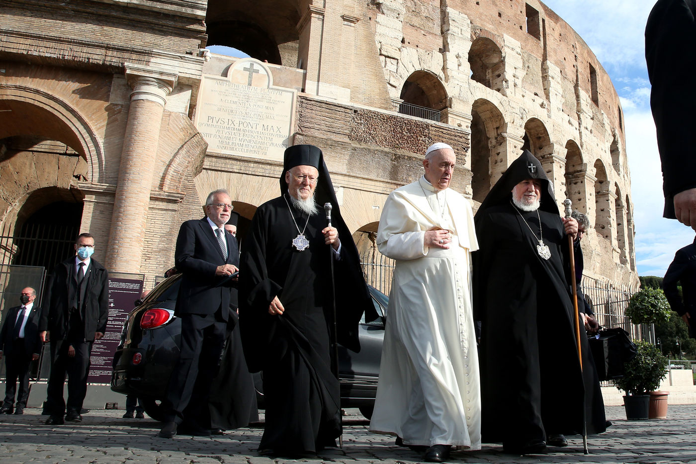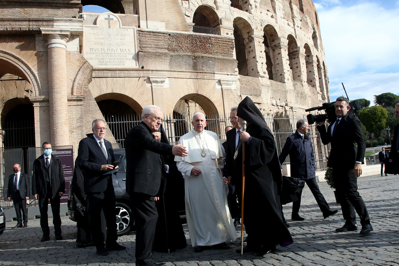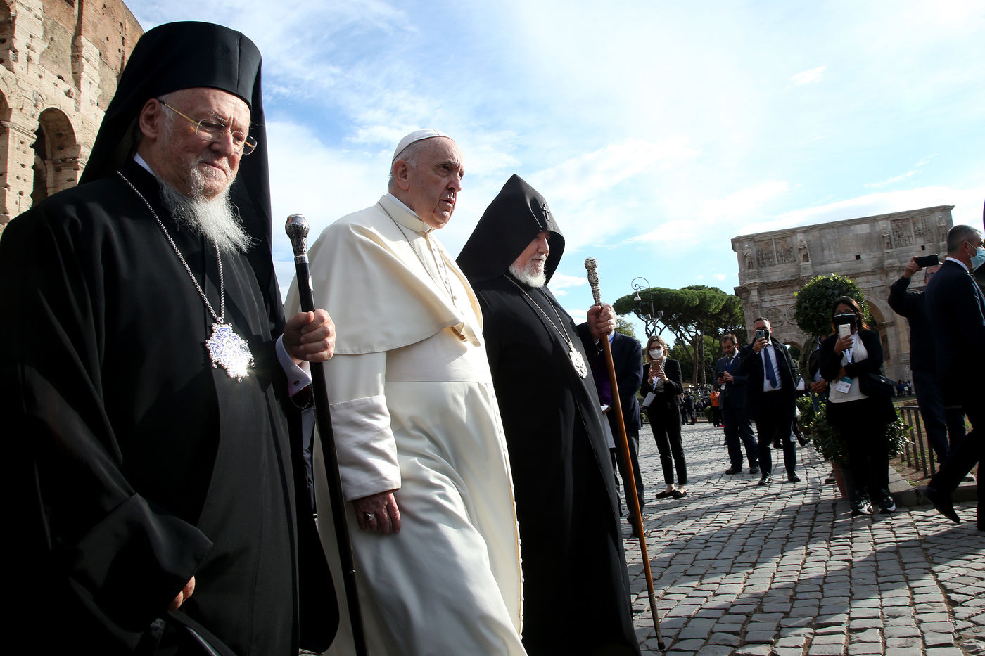 Italy, Rome, Colosseum, 2021/10/07. International meeting "Peoples brothers, future land. Religions and Cultures in Dialogue " at the Colosseum in Rome . Pope Francis during the ecumenical prayer of Christians, joins the leaders of other world religions such as the great Imam of the University of Al Azar (Cairo), Al Tayyeb, the Orthodox Patriarch Bartholomew I and the President of the Conference of European Rabbis Pinchas Goldschmidt, along with Buddhist and Hindu exponents at the Colosseum in Rome.