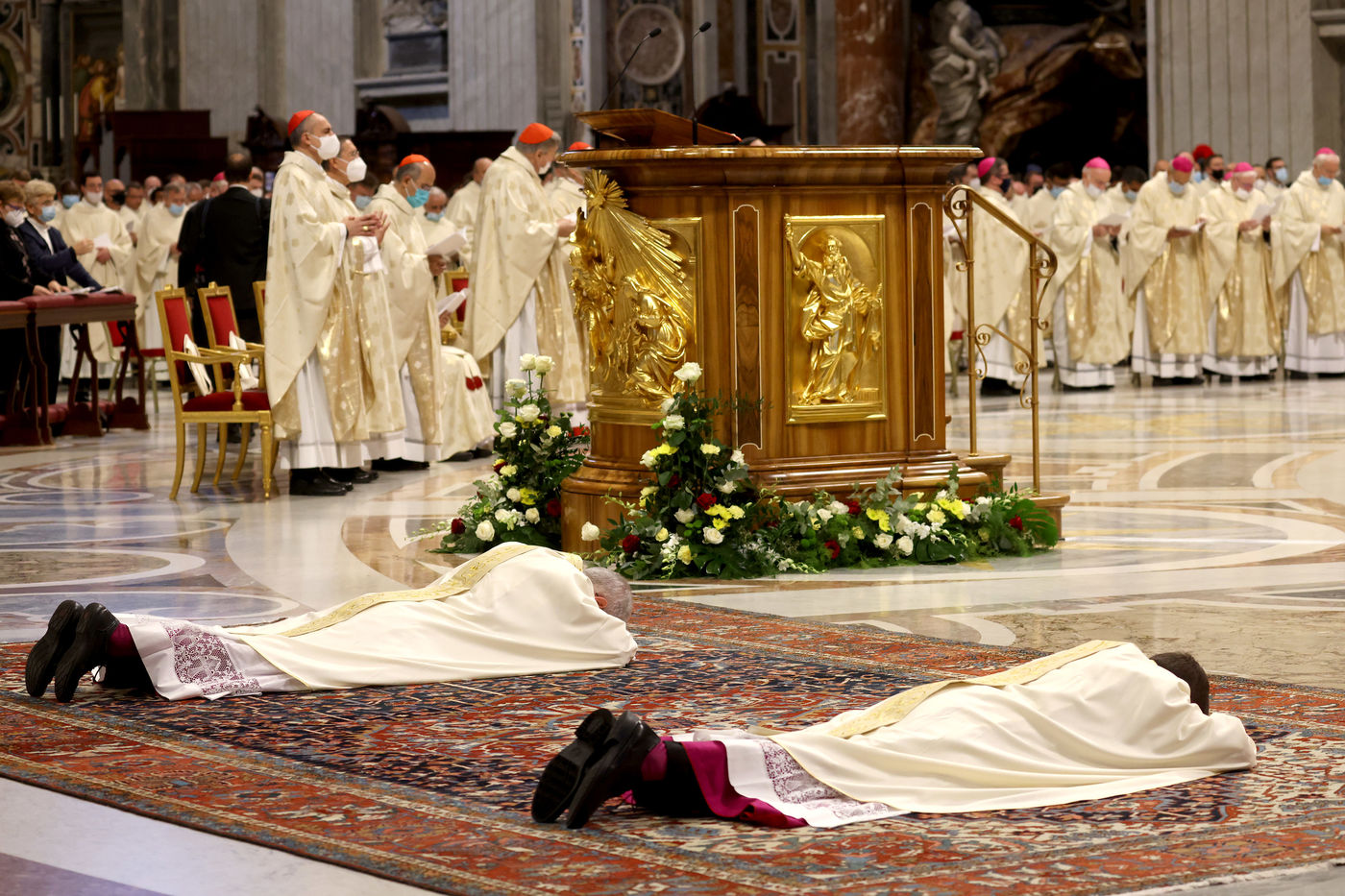 Italy, Rome, Vatican, 2021/10/17. Pope Francis celebrates the Holy Mass, during which he conferred Episcopal Ordination on Mgr. Guido Marini, Bishop of Tortona, and Mgr. Andres Gabriel Ferrada Moreira, Secretary of the Congregation for the Clergy, in St Peter's Basilica. Photograph by Franco Origlia / Vatican Pool / CPP / HANS LUCAS.